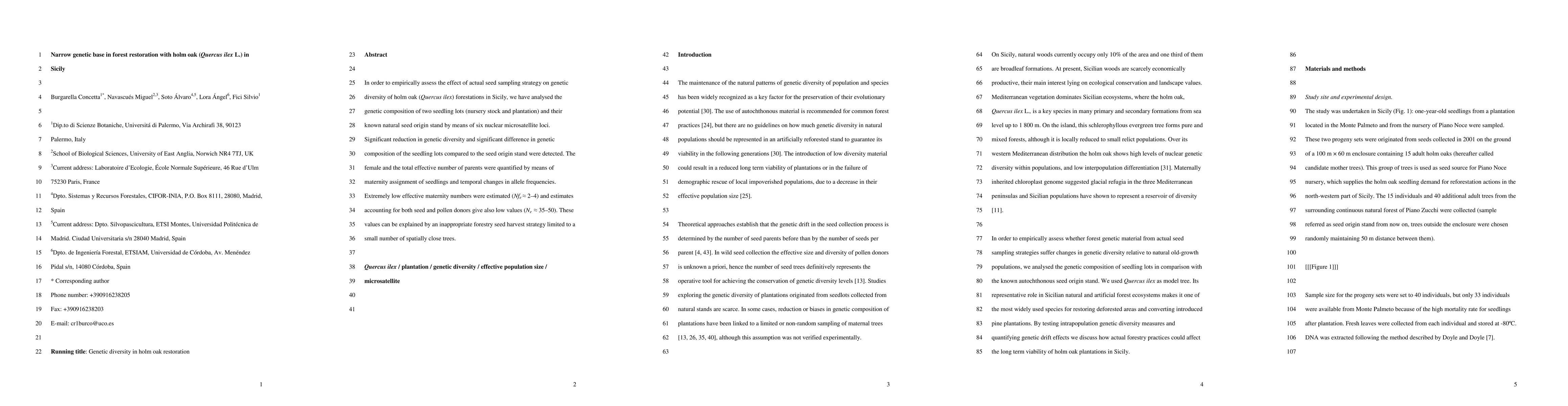 This study reveals that the genetic diversity of holm oak (Quercus ilex) reforestation efforts in Sicily is significantly reduced due to a narrow genetic base, caused by an inadequate seed sampling strategy that relies on a small number of nearby trees. The low effective maternity and total effective numbers of parents highlight the need for improved forestry practices.