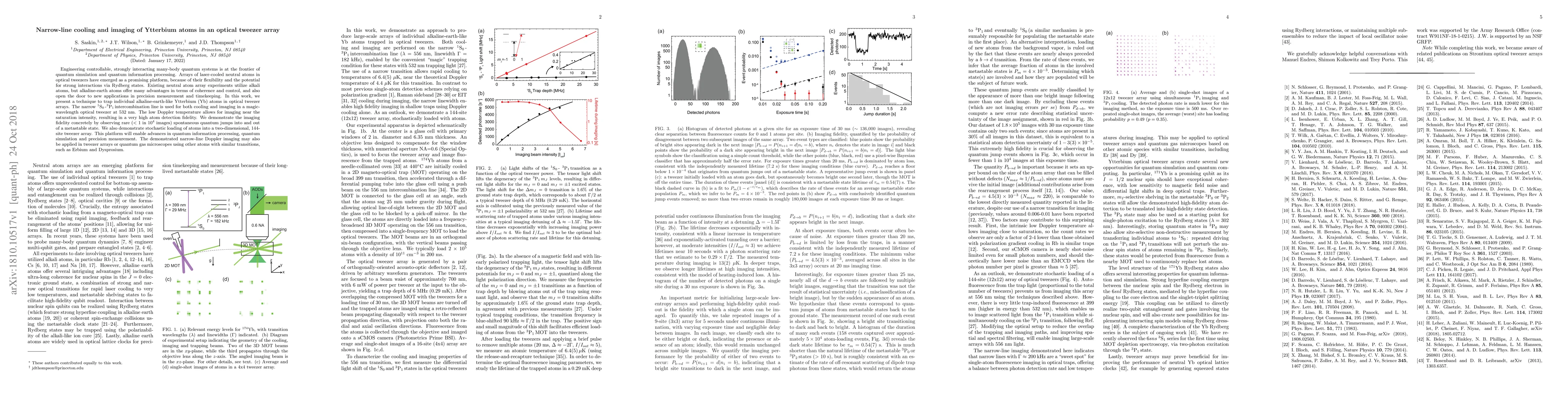 This paper presents a technique to trap and optically cool Ytterbium atoms in an optical tweezer array, utilizing the narrow intercombination line for both cooling and high-fidelity imaging. The demonstrated platform opens avenues for quantum information processing, simulation, and precision measurement.