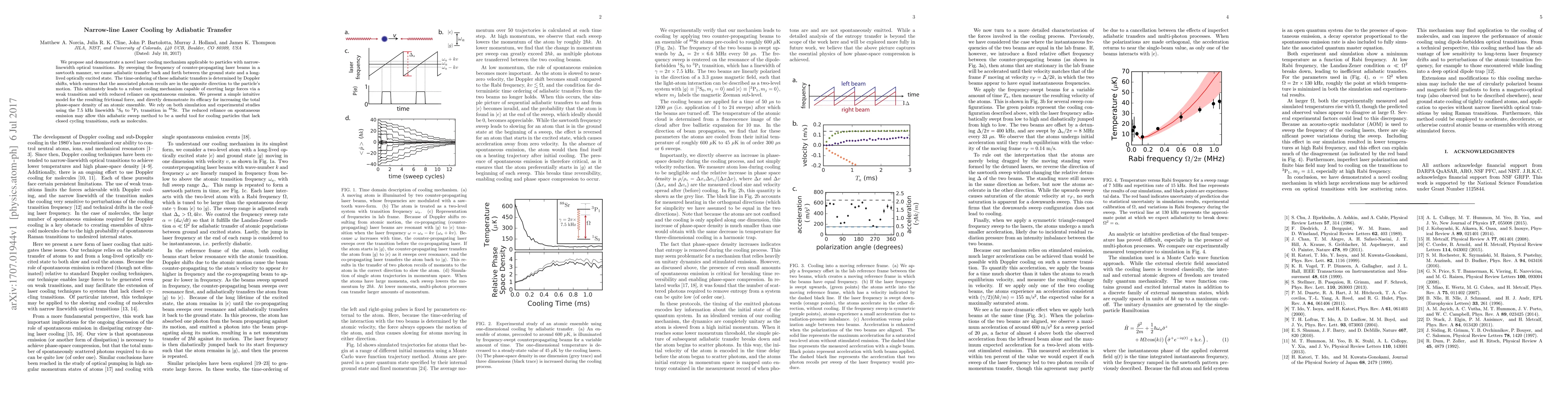 This paper proposes and demonstrates a novel laser cooling method for particles with narrow optical transitions, using adiabatic transfer between ground and excited states via frequency-swept counter-propagating laser beams. The method effectively cools by minimizing spontaneous emission, potentially extending to molecules lacking closed cycling transitions.