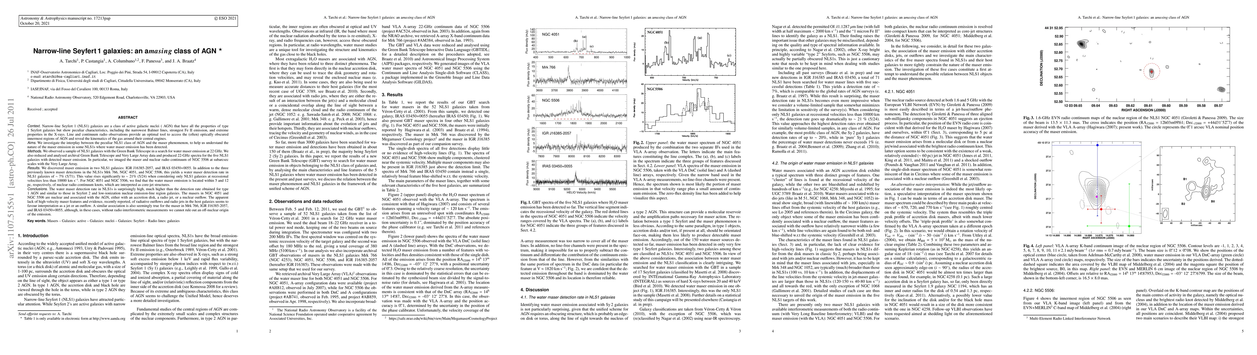 [Abridged] Narrow-line Seyfert 1 (NLS1) galaxies are a class of active galactic nuclei (AGN) that have all the properties of type 1 Seyfert galaxies but show peculiar characteristics, including the narrowest Balmer lines, strongest Fe II emission, and extreme properties in the X-rays. Line and continuum radio observations provide an optimal tool to access the (often) optically obscured innermost regions of AGN and reveal the kinematics of the gas around their central engines. We investigate the interplay between the peculiar NLS1 class of AGN and the maser phenomenon, to help us understand the nature of the maser emission in some NLS1s where water maser emission has been detected. We observed a sample of NLS1 galaxies with the Green Bank Telescope in a search for water maser emission at 22 GHz. We also reduced and analysed archival Green Bank Telescope and Very Large Array data and produced 22-GHz spectra for the five NLS1 galaxies with detected maser emission. In particular, we imaged the maser and nuclear radio continuum of NGC5506 at subarcsec scales with the Very Large Array. We discovered maser emission in two NLS1 galaxies: IGRJ16385-2057, and IRAS03450+0055. In addition to the three previously known maser detections in the NLS1s Mrk766, NGC4051, and NGC5506, this yields a water maser detection rate in NLS1 galaxies of ~7% (5/71). This value rises significantly to ~21% (5/24) when considering only NLS1 galaxies at recessional velocities less than 10000 km/s. For NGC4051 and NGC5506, we find that the water maser emission is located within 5 and 12 pc, respectively, of nuclear radio continuum knots, which are interpreted as core-jet structures.