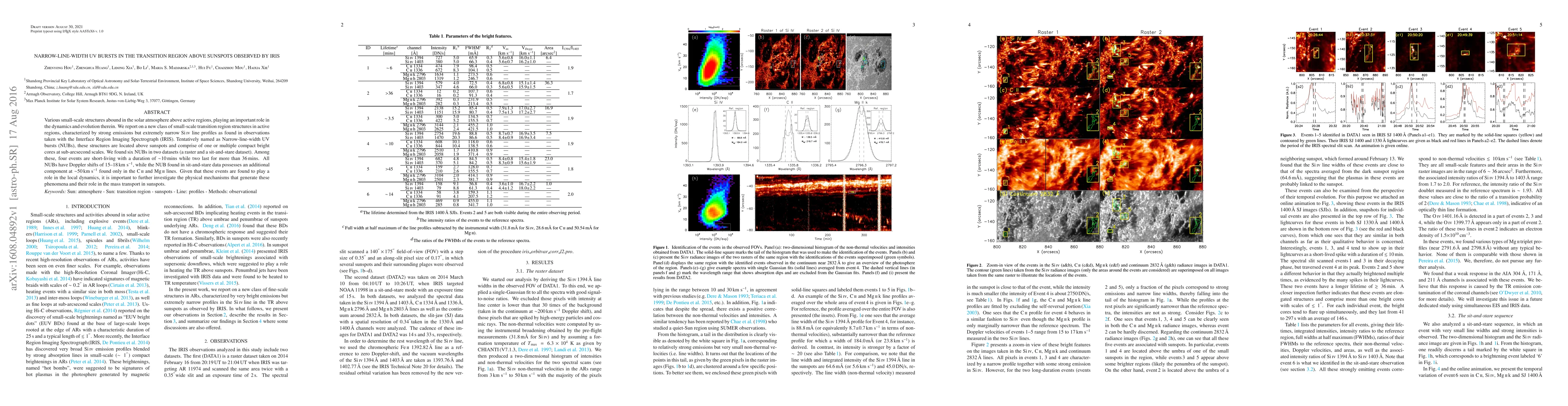 This study identifies a new class of small-scale structures above sunspots called Narrow-line-width UV bursts (NUBs), characterized by strong emissions and extremely narrow Si IV line profiles observed by IRIS. These NUBs, found in active regions, have short-lived and long-lived events, suggesting varied physical mechanisms and potential roles in local dynamics and mass transport in sunspots.