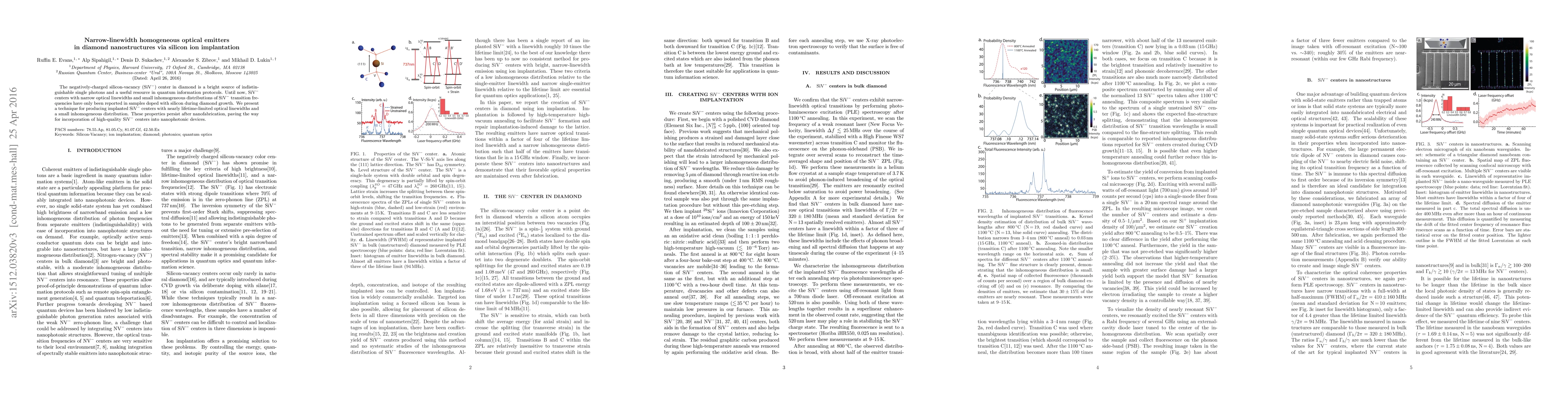 This paper introduces a method for creating narrow-linewidth $\mathrm{SiV}^{-}$ centers in diamond nanostructures via silicon ion implantation, achieving nearly lifetime-limited optical linewidths and small inhomogeneous distributions. These high-quality $\mathrm{SiV}^{-}$ centers are suitable for integration into nanophotonic devices.