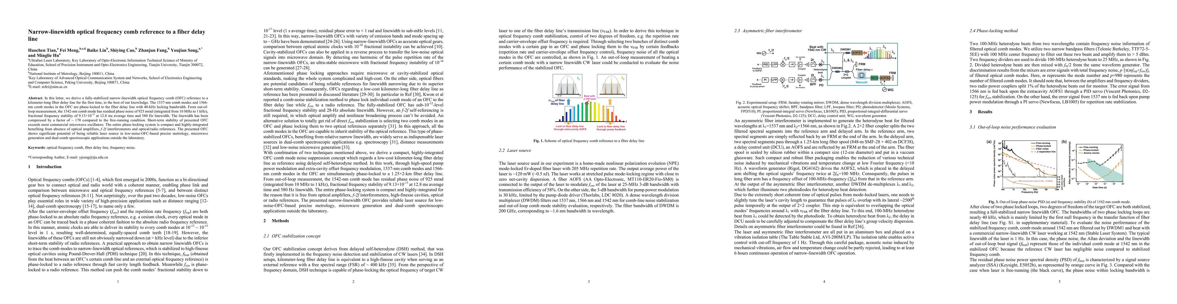 In this letter, we derive a fully-stabilized narrow-linewidth optical frequency comb (OFC) reference to a kilometer-long fiber delay line for the first time, to the best of our knowledge. The 1537-nm comb modes and 1566-nm comb modes in the OFC are phase-locked to the fiber delay line with 40-kHz locking bandwidth. From out-of-loop measurement, the 1542-nm comb mode has residual phase noise of 925 mrad (integrated from 10 MHz to 1 kHz), fractional frequency stability of 9.13*10(-13) at 12.8 ms average time and 580 Hz linewidth. The linewidth has been compressed by a factor of ~ 170 compared to the free-running condition. Short-term stability of presented OFC exceeds most commercial microwave oscillators. The entire phase-locking system is compact and highly-integrated benefiting from absence of optical amplifiers, f-2f interferometers and optical/radio references. The presented OFC shows significant potential of being reliable laser source in low-noise-OFC-based precise metrology, microwave generation and dual-comb spectroscopic applications outside the laboratory.