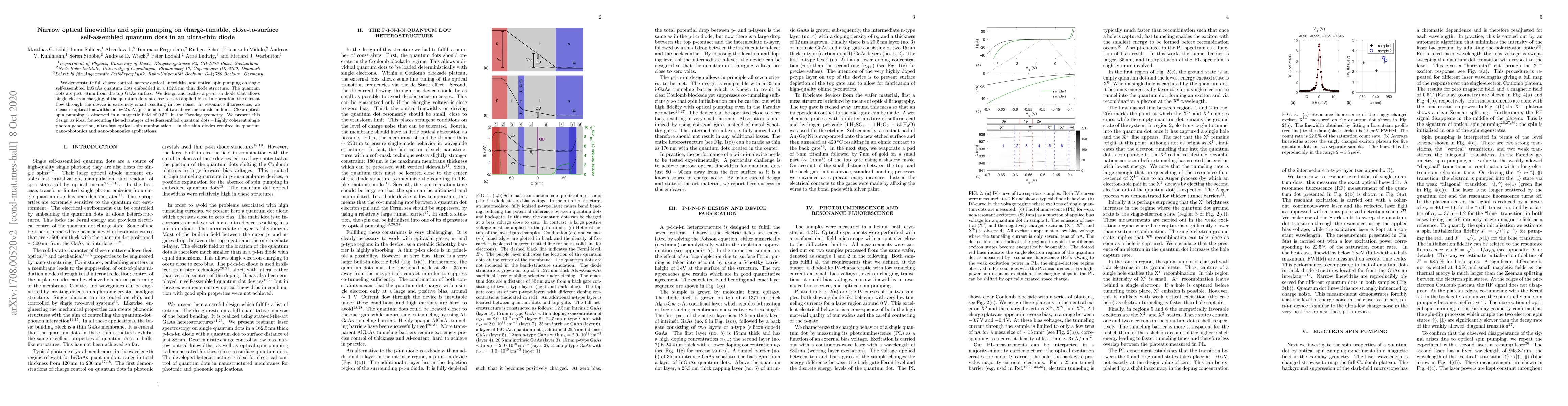 We demonstrate full charge control, narrow optical linewidths, and optical spin pumping on single self-assembled InGaAs quantum dots embedded in a $162.5\,\text{nm}$ thin diode structure. The quantum dots are just $88\,\text{nm}$ from the top GaAs surface. We design and realize a p-i-n-i-n diode that allows single-electron charging of the quantum dots at close-to-zero applied bias. In operation, the current flow through the device is extremely small resulting in low noise. In resonance fluorescence, we measure optical linewidths below $2\,\mu\text{eV}$, just a factor of two above the transform limit. Clear optical spin pumping is observed in a magnetic field of $0.5\,\text{T}$ in the Faraday geometry. We present this design as ideal for securing the advantages of self-assembled quantum dots -- highly coherent single photon generation, ultra-fast optical spin manipulation -- in the thin diodes required in quantum nano-photonics and nano-phononics applications.