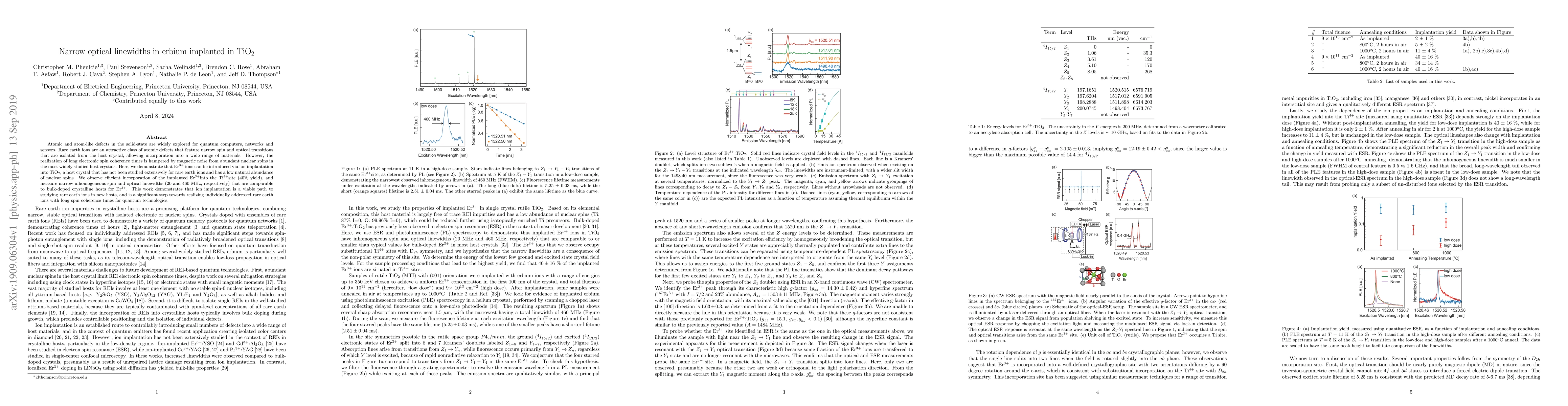 Atomic and atom-like defects in the solid-state are widely explored for quantum computers, networks and sensors. Rare earth ions are an attractive class of atomic defects that feature narrow spin and optical transitions that are isolated from the host crystal, allowing incorporation into a wide range of materials. However, the realization of long electronic spin coherence times is hampered by magnetic noise from abundant nuclear spins in the most widely studied host crystals. Here, we demonstrate that Er$^{3+}$ ions can be introduced via ion implantation into TiO$_2$, a host crystal that has not been studied extensively for rare earth ions and has a low natural abundance of nuclear spins. We observe efficient incorporation of the implanted Er$^{3+}$ into the Ti$^{4+}$ site (40% yield), and measure narrow inhomogeneous spin and optical linewidths (20 and 460 MHz, respectively) that are comparable to bulk-doped crystalline hosts for Er$^{3+}$. This work demonstrates that ion implantation is a viable path to studying rare earth ions in new hosts, and is a significant step towards realizing individually addressed rare earth ions with long spin coherence times for quantum technologies.