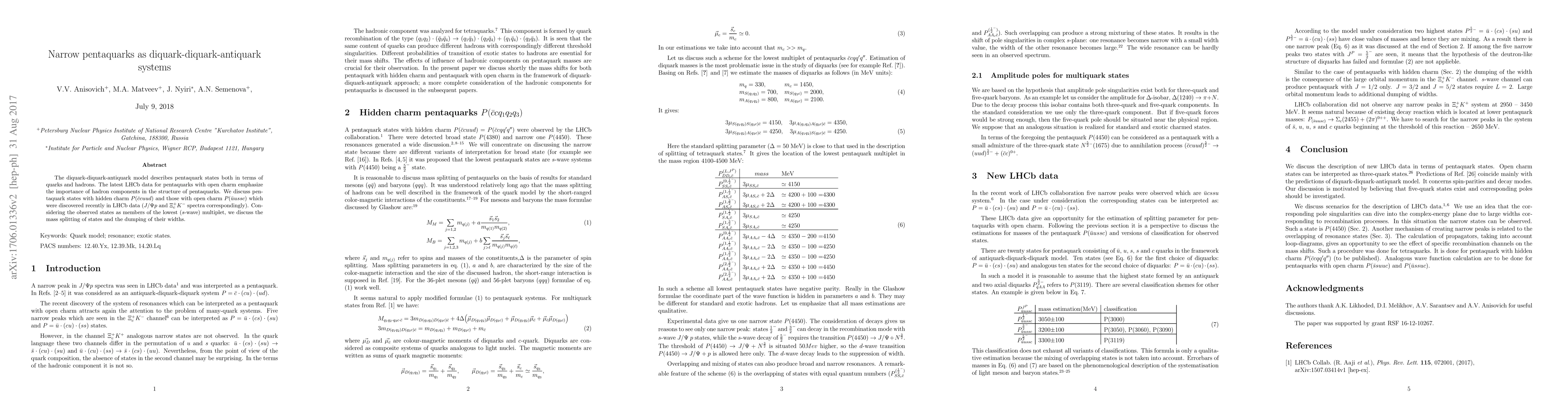 The diquark-diquark-antiquark model describes pentaquark states both in terms of quarks and hadrons. The latest LHCb data for pentaquarks with open charm emphasize the importance of hadron components in the structure of pentaquarks. We discuss pentaquark states with hidden charm $P(\bar c cuud)$ and those with open charm $P(\bar uussc)$ which were discovered recently in LHCb data ($J/\Psi p$ and $\Xi_c^+ K^-$ spectra correspondingly). Considering the observed states as members of the lowest (s-wave) multiplet we discuss the mass splitting of states and the dumping of their widths.