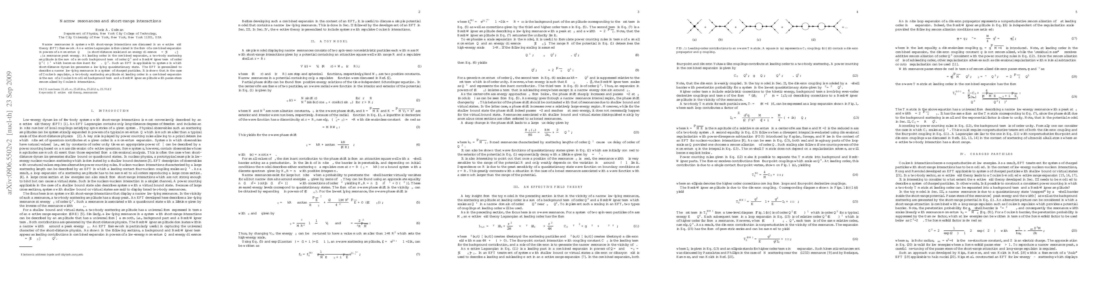 Narrow resonances in systems with short-range interactions are discussed in an effective field theory (EFT) framework. An effective Lagrangian is formulated in the form of a combined expansion in powers of a momentum Q << Lambda--a short-distance scale--and an energy difference delta epsilon = |E-epsilon_0| << epsilon_0--a resonance peak energy. At leading order in the combined expansion, a two-body scattering amplitude is the sum of a smooth background term of order Q^0 and a Breit-Wigner term of order Q^2 (delta epsilon)^{-1} which becomes dominant for delta epsilon <~ Q^3. Such an EFT is applicable to systems in which short-distance dynamics generates a low-lying quasistationary state. The EFT is generalized to describe a narrow low-lying resonance in a system of charged particles. It is shown that in the case of Coulomb repulsion, a two-body scattering amplitude at leading order in a combined expansion is the sum of a Coulomb-modified background term and a Breit-Wigner amplitude with parameters renormalized by Coulomb interactions.