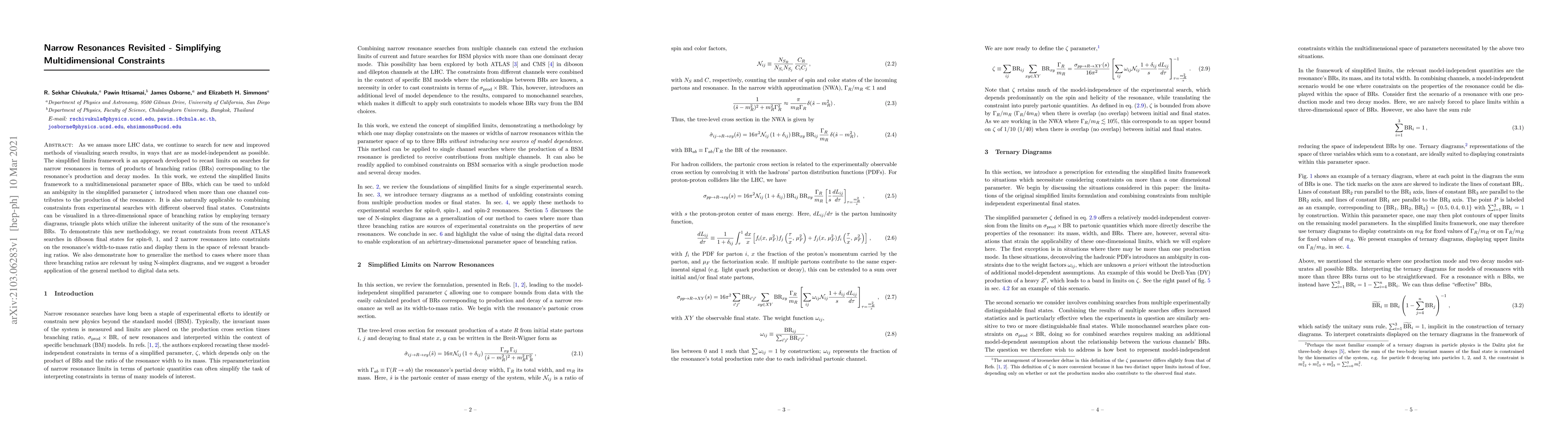 As we amass more LHC data, we continue to search for new and improved methods of visualizing search results, in ways that are as model-independent as possible. The simplified limits framework is an approach developed to recast limits on searches for narrow resonances in terms of products of branching ratios (BRs) corresponding to the resonance's production and decay modes. In this work, we extend the simplified limits framework to a multidimensional parameter space of BRs, which can be used to unfold an ambiguity in the simplified parameter $\zeta$ introduced when more than one channel contributes to the production of the resonance. It is also naturally applicable to combining constraints from experimental searches with different observed final states. Constraints can be visualized in a three-dimensional space of branching ratios by employing ternary diagrams, triangle plots which utilize the inherent unitarity of the sum of the resonance's BRs. To demonstrate this new methodology, we recast constraints from recent ATLAS searches in diboson final states for spin-0, 1, and 2 narrow resonances into constraints on the resonance's width-to-mass ratio and display them in the space of relevant branching ratios. We also demonstrate how to generalize the method to cases where more than three branching ratios are relevant by using N-simplex diagrams, and we suggest a broader application of the general method to digital data sets.