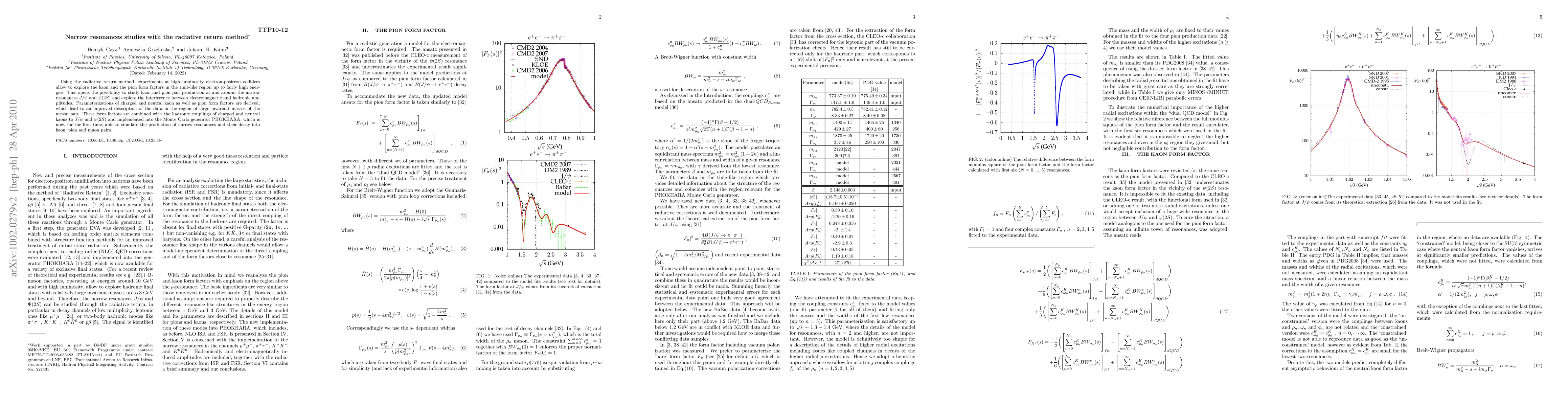 Using the radiative return method, experiments at high luminosity electron-positron colliders allow to explore the kaon and the pion form factors in the time-like region up to fairly high energies. This opens the possibility to study kaon and pion pair production at and around the narrow resonances J/psi and psi(2S) and explore the interference between electromagnetic and hadronic amplitudes. Parameterizations of charged and neutral kaon as well as pion form factors are derived, which lead to an improved description of the data in the region of large invariant masses of the meson pair. These form factors are combined with the hadronic couplings of charged and neutral kaons to J/psi and psi(2S) and implemented into the Monte Carlo generator PHOKHARA, which is now, for the first time, able to simulate the production of narrow resonances and their decay into kaon, pion and muon pairs.