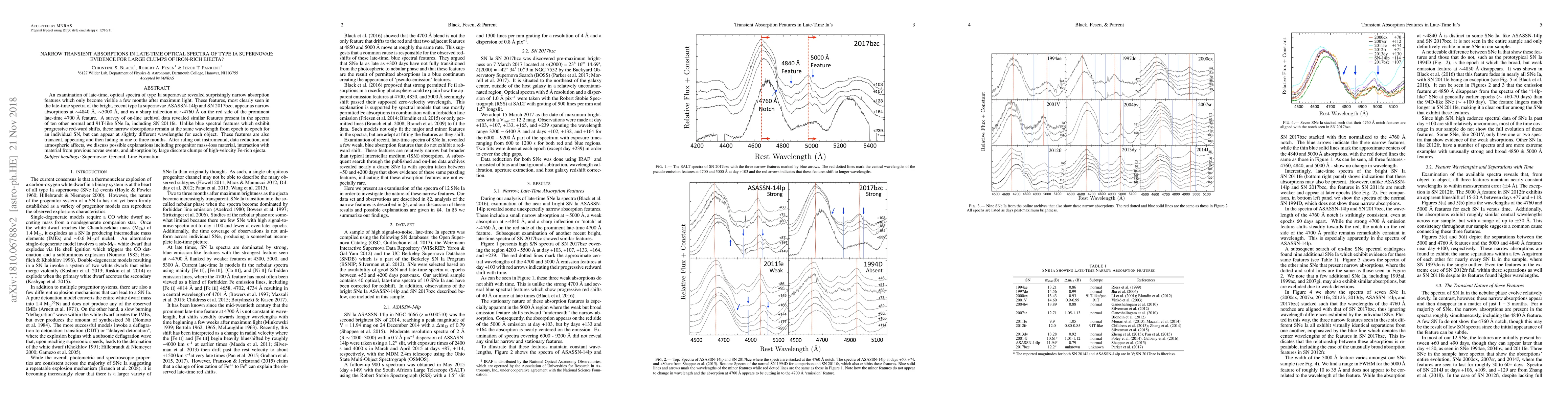 This study identifies narrow transient absorptions in late-time optical spectra of Type Ia supernovae, suggesting the presence of large clumps of iron-rich ejecta. These features remain stable in wavelength over time but vary slightly between different supernovae, indicating possible large, discrete clumps of Fe-rich material.