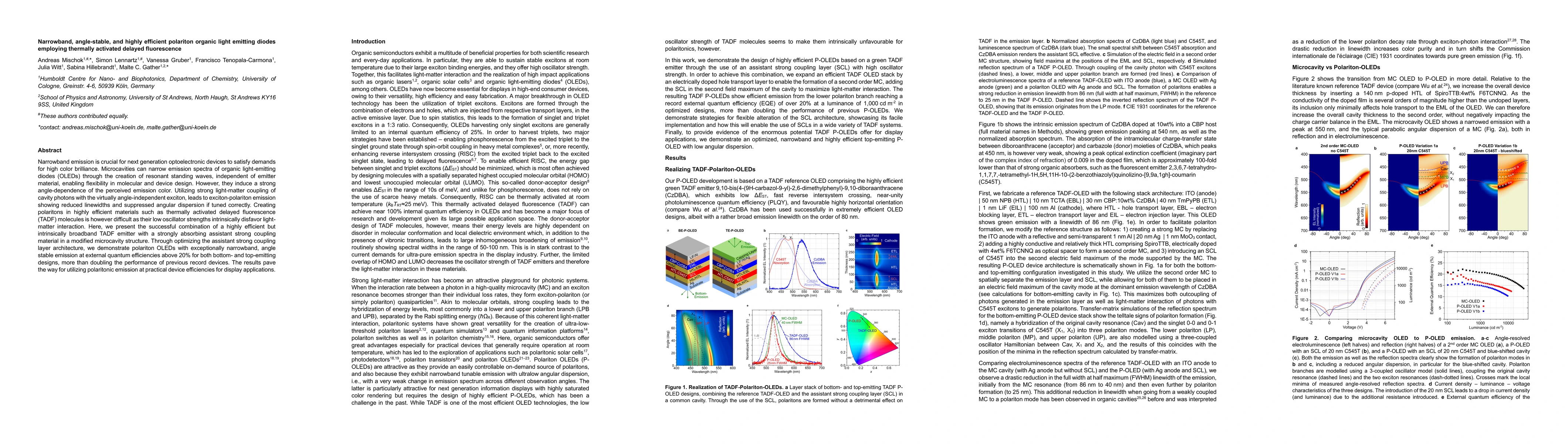 The research presents a modified microcavity structure combining a highly efficient but broad TADF emitter with a strongly absorbing assistant strong coupling material.