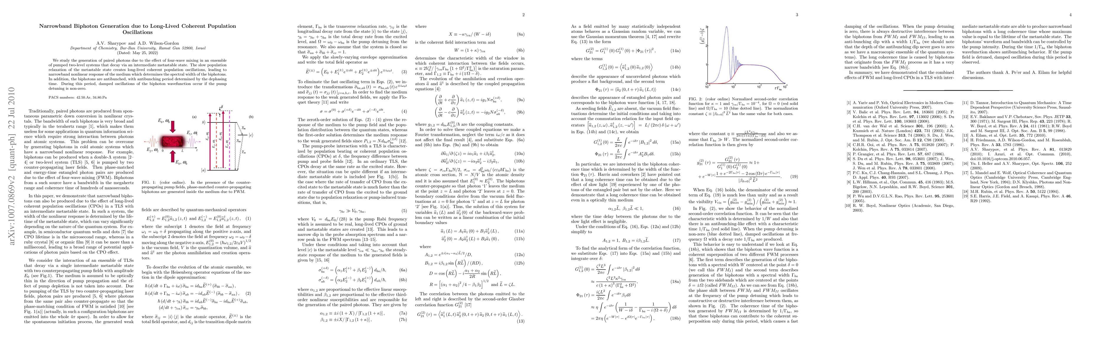 We study the generation of paired photons due to the effect of four-wave mixing in an ensemble of pumped two-level systems that decay via an intermediate metastable state. The slow population relaxation of the metastable state to the ground state is utilized to create long-lived coherent population oscillation, leading to narrowband nonlinear response of the medium. The biphotons have a narrow bandwidth, long coherence time and length, which can be controlled by the pump field. In addition, the biphotons are antibunched, with antibunching period determined by the dephasing time. During this period, damped oscillations of the biphoton wavefunction occurs if the pump detuning is non-zero.