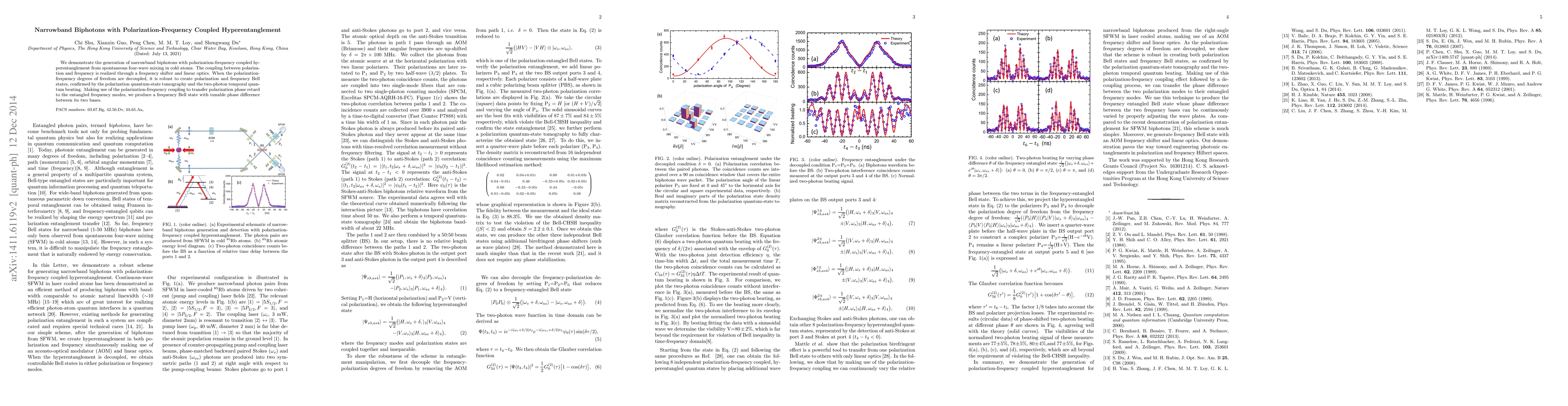 This paper demonstrates the generation of narrowband biphotons with polarization-frequency coupled hyperentanglement via spontaneous four-wave mixing in cold atoms. The study confirms the robustness of creating polarization and frequency Bell states through polarization quantum-state tomography and temporal quantum beating, and introduces a method to produce a tunable frequency Bell state by transferring polarization phase retard to the entangled frequency modes.