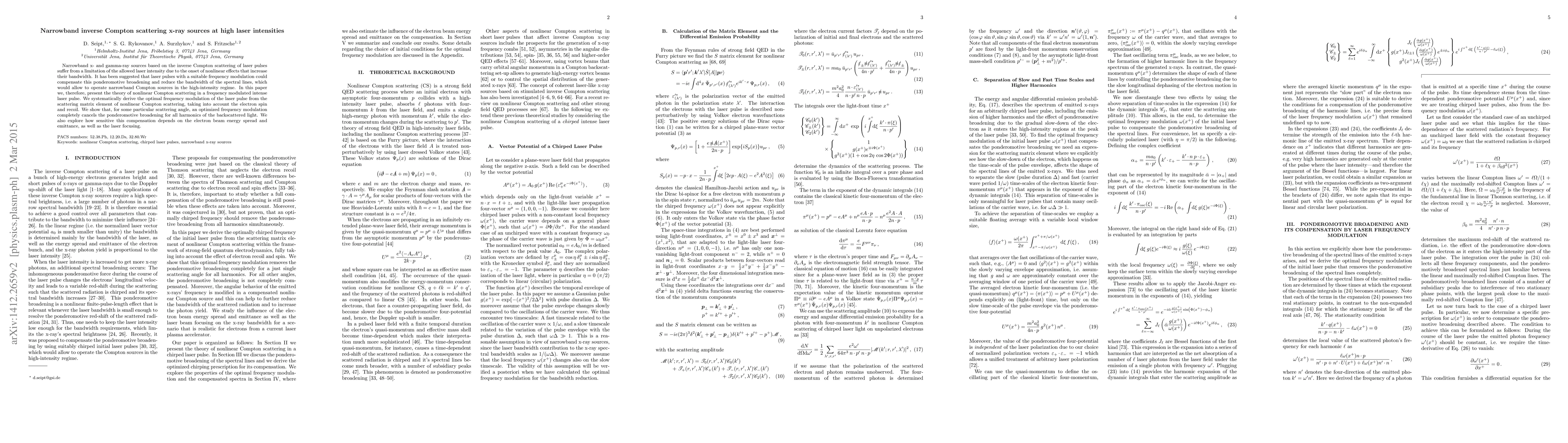 This paper presents a theoretical framework for nonlinear Compton scattering in frequency modulated high-intensity laser pulses, aiming to reduce the bandwidth of narrowband x-ray sources. It derives optimal frequency modulation to cancel ponderomotive broadening, considering electron spin and recoil, and examines the sensitivity to beam and laser parameters.