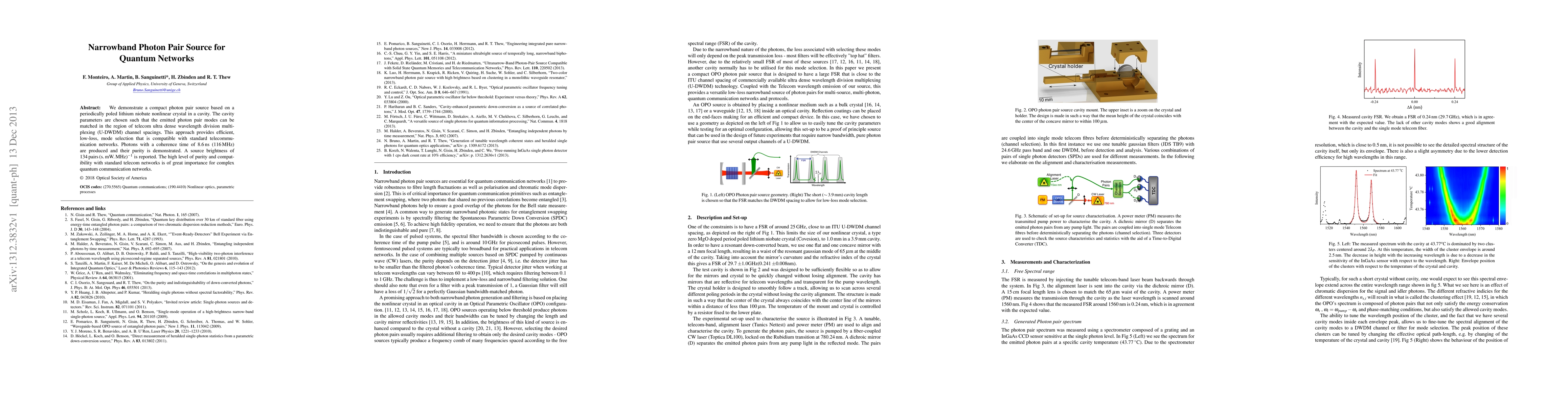 We demonstrate a compact photon pair source based on a periodically poled lithium niobate nonlinear crystal in a cavity. The cavity parameters are chosen such that the emitted photon pair modes can be matched in the region of telecom ultra dense wavelength division multiplexing (U-DWDM) channel spacings. This approach provides efficient, low-loss, mode selection that is compatible with standard telecommunication networks. Photons with a coherence time of 8.6 ns (116 MHz) are produced and their purity is demonstrated. A source brightness of 134 pairs(s.mW.MHz)$^{-1}$ is reported. The high level of purity and compatibility with standard telecom networks is of great importance for complex quantum communication networks.