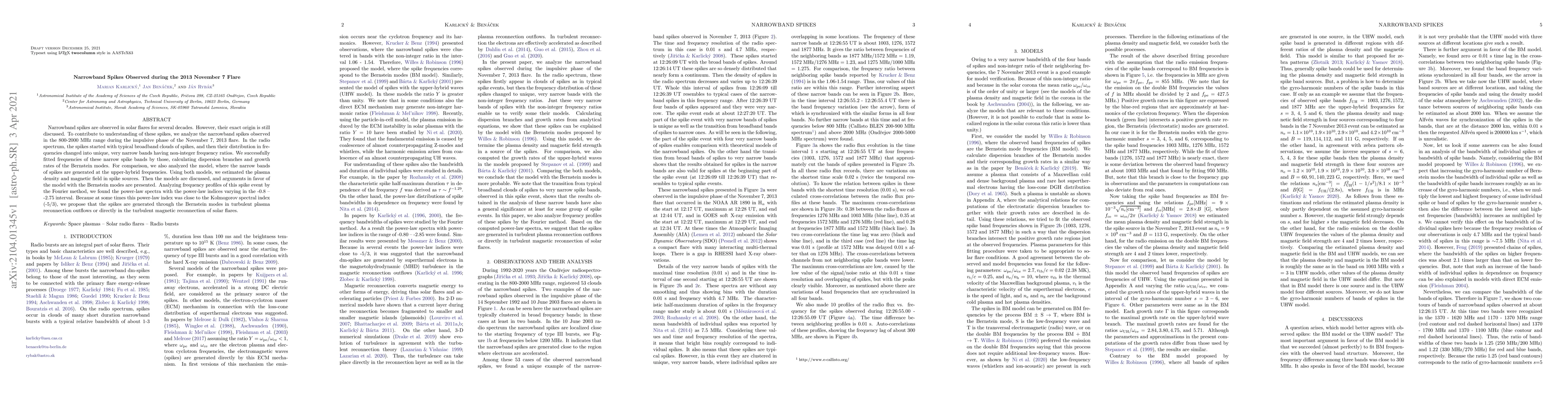 Narrowband spikes are observed in solar flares for several decades. However, their exact origin is still discussed. To contribute to understanding of these spikes, we analyze the narrowband spikes observed in the 800-2000 MHz range during the impulsive phase of the November 7, 2013 flare. In the radio spectrum, the spikes started with typical broadband clouds of spikes, and then their distribution in frequencies changed into unique, very narrow bands having non-integer frequency ratios. We successfully fitted frequencies of these narrow spike bands by those, calculating dispersion branches and growth rates of the Bernstein modes. For comparison, we also analyzed the model, where the narrow bands of spikes are generated at the upper-hybrid frequencies. Using both models, we estimated the plasma density and magnetic field in spike sources. Then the models are discussed, and arguments in favor of the model with the Bernstein modes are presented. Analyzing frequency profiles of this spike event by the Fourier method, we found the power-law spectra with the power-law indices varying in the -0.8 -- -2.75 interval. Because at some times this power-law index was close to the Kolmogorov spectral index (-5/3), we propose that the spikes are generated through the Bernstein modes in turbulent plasma reconnection outflows or directly in the turbulent magnetic reconnection of solar flares.
