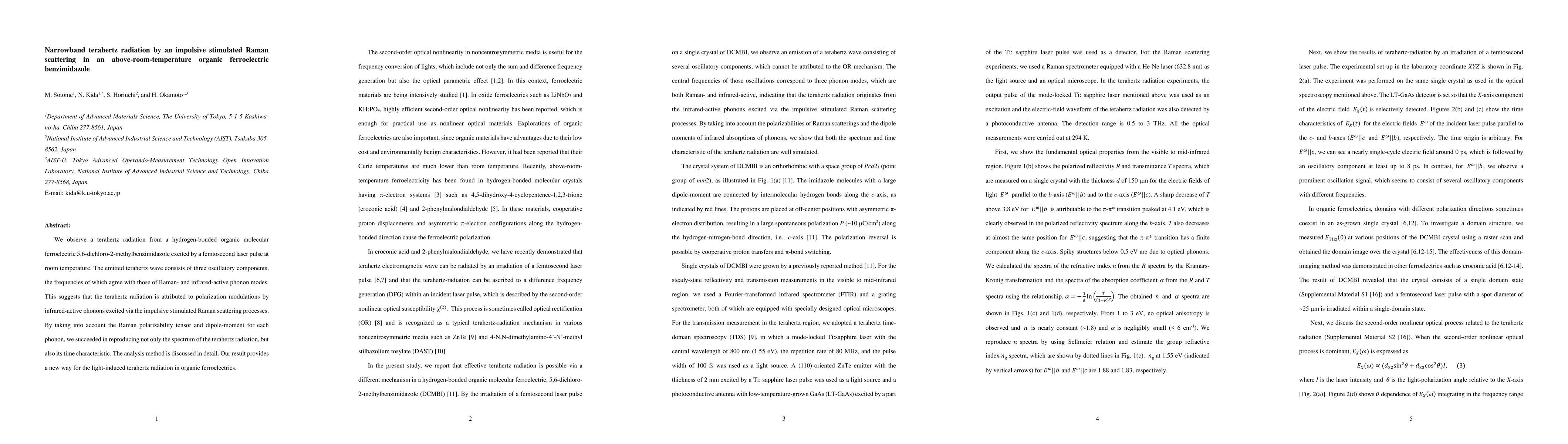 This paper reports on the generation of narrowband terahertz radiation from an organic ferroelectric material, 5,6-dichloro-2-methylbenzimidazole, using femtosecond laser pulses at room temperature. The terahertz emission is attributed to impulsive stimulated Raman scattering, with the observed frequencies matching Raman- and infrared-active phonon modes.