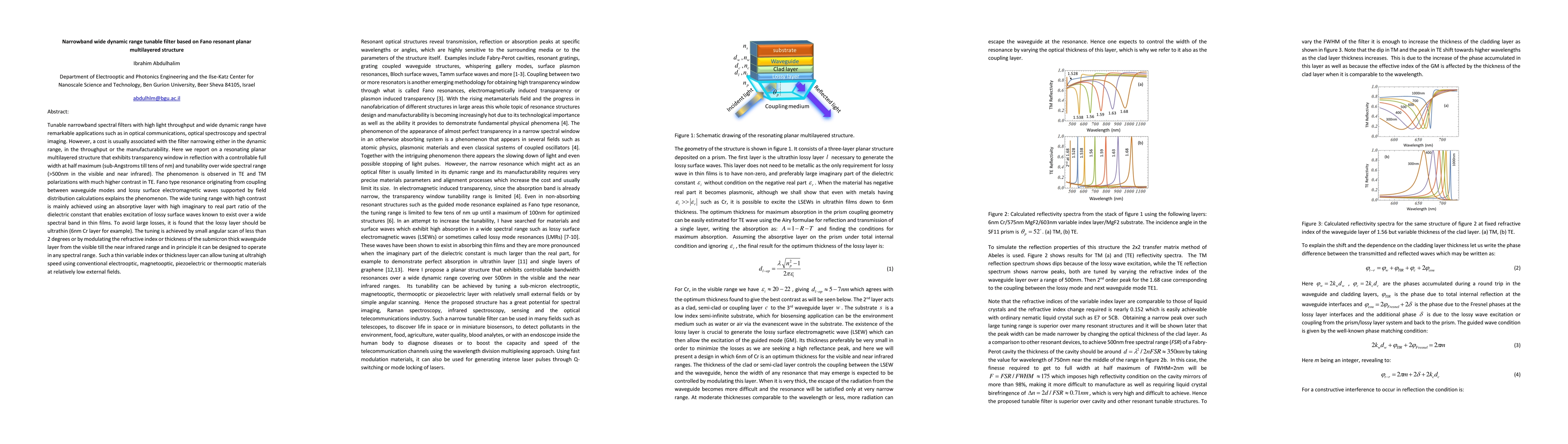 Tunable narrowband spectral filters with high light throughput and wide dynamic range have remarkable applications such as in optical communications, optical spectroscopy and spectral imaging. However, a cost is usually associated with the filter narrowing either in the dynamic range, in the throughput or the manufacturability. Here we report on a resonating planar multilayered structure that exhibits transparency window in reflection with a controllable full width at half maximum (sub-Angstroms till tens of nm) and tunability over wide spectral range (>500nm in the visible and near infrared). The phenomenon is observed in TE and TM polarizations with much higher contrast in TE. Fano type resonance originating from coupling between waveguide modes and lossy surface electromagnetic waves supported by field distribution calculations explains the phenomenon. The wide tuning range with high contrast is mainly achieved using an absorptive layer with high imaginary to real part ratio of the dielectric constant that enables excitation of lossy surface waves known to exist over a wide spectral band in thin films. To avoid large losses, it is found that the lossy layer should be ultrathin (6nm Cr layer for example). The tuning is achieved by small angular scan of less than 2 degrees or by modulating the refractive index or thickness of the submicron thick waveguide layer from the visible till the near infrared range and in principle it can be designed to operate in any spectral range. Such a thin variable index or thickness layer can allow tuning at ultrahigh speed using conventional electrooptic, magnetooptic, piezoelectric or thermooptic materials at relatively low external fields.