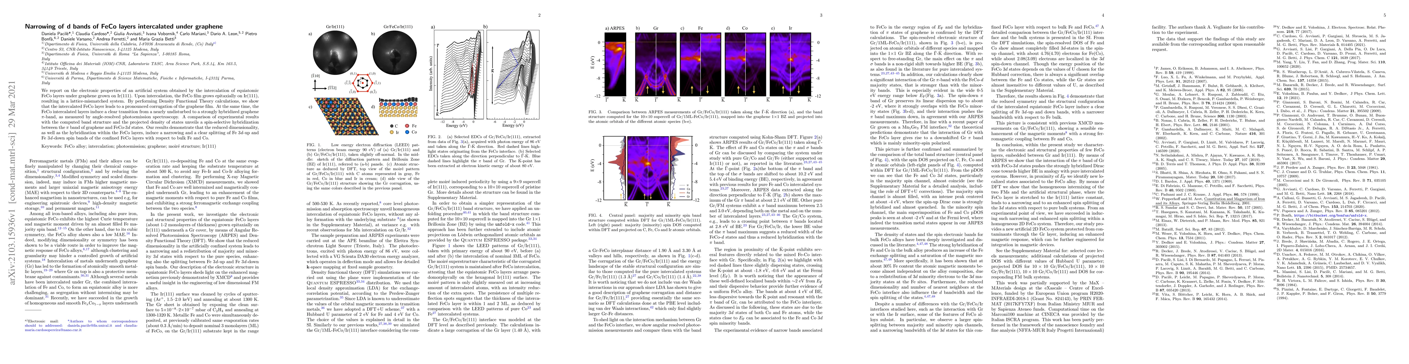 We report on the electronic properties of an artificial system obtained by the intercalation of equiatomic FeCo layers under graphene grown on Ir(111). Upon intercalation, the FeCo film grows epitaxially on Ir(111), resulting in a lattice-mismatched system. By performing Density Functional Theory calculations, we show that the intercalated FeCo layer leads to a pronounced corrugation of the graphene film. At the same time, the FeCo intercalated layers induce a clear transition from a nearly undisturbed to a strongly hybridized graphene {\pi}-band, as measured by angle-resolved photoemission spectroscopy. A comparison of experimental results with the computed band structure and the projected density of states unveils a spin-selective hybridization between the {\pi} band of graphene and FeCo-3d states. Our results demonstrate that the reduced dimensionality, as well as the hybridization within the FeCo layers, induce a narrowing and a clear splitting of Fe 3d-up and Fe 3d-down spin bands of the confined FeCo layers with respect to bulk Fe and Co.
