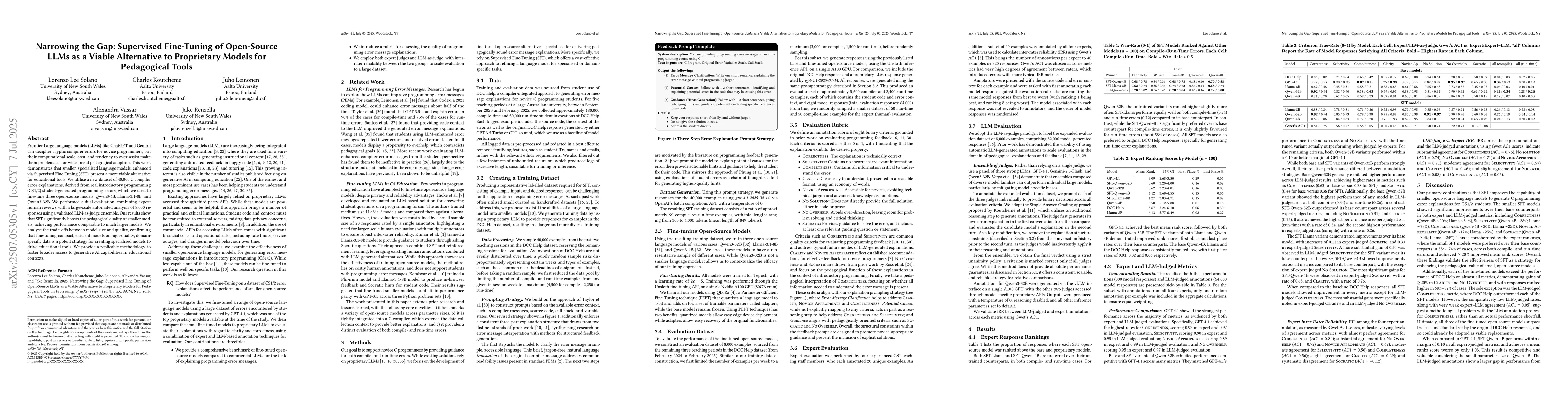 Frontier Large language models (LLMs) like ChatGPT and Gemini can decipher cryptic compiler errors for novice programmers, but their computational scale, cost, and tendency to over-assist make them problematic for widespread pedagogical adoption. This work demonstrates that smaller, specialised language models, enhanced via Supervised Fine-Tuning (SFT), present a more viable alternative for educational tools. We utilise a new dataset of 40,000 C compiler error explanations, derived from real introductory programming (CS1/2) student-generated programming errors, which we used to fine-tune three open-source models: Qwen3-4B, Llama-3.1-8B, and Qwen3-32B. We performed a dual evaluation, combining expert human reviews with a large-scale automated analysis of 8,000 responses using a validated LLM-as-judge ensemble. Our results show that SFT significantly boosts the pedagogical quality of smaller models, achieving performance comparable to much larger models. We analyse the trade-offs between model size and quality, confirming that fine-tuning compact, efficient models on high-quality, domain-specific data is a potent strategy for creating specialised models to drive educational tools. We provide a replicable methodology to foster broader access to generative AI capabilities in educational contexts.
