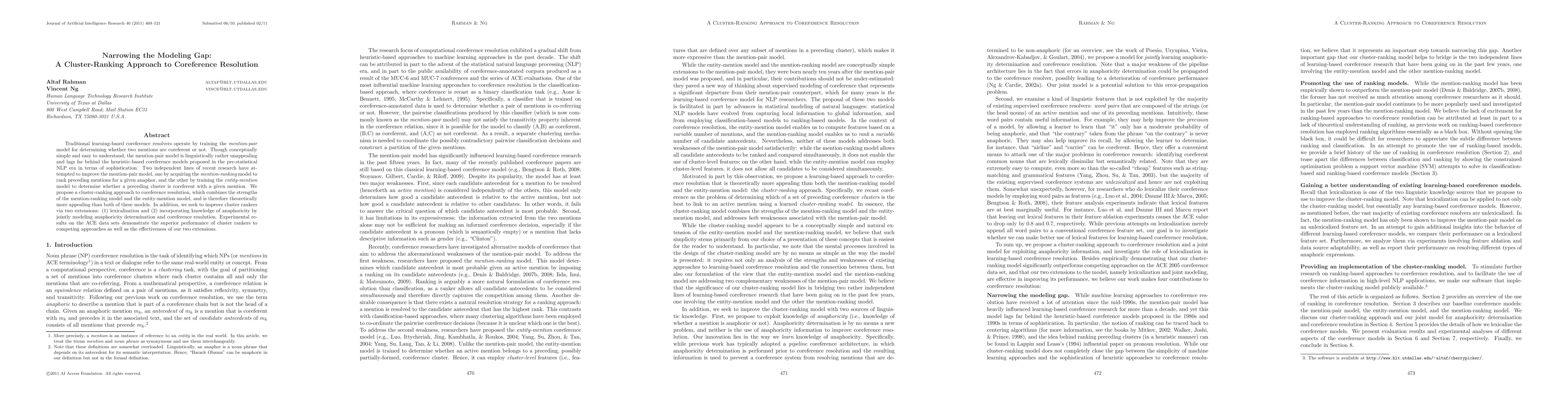 This paper proposes a cluster-ranking approach to coreference resolution that combines mention-ranking and entity-mention models, aiming to bridge the gap between traditional mention-pair models and more sophisticated heuristic-based models. The approach is enhanced with lexicalization and anaphoricity knowledge, showing superior performance on the ACE datasets.