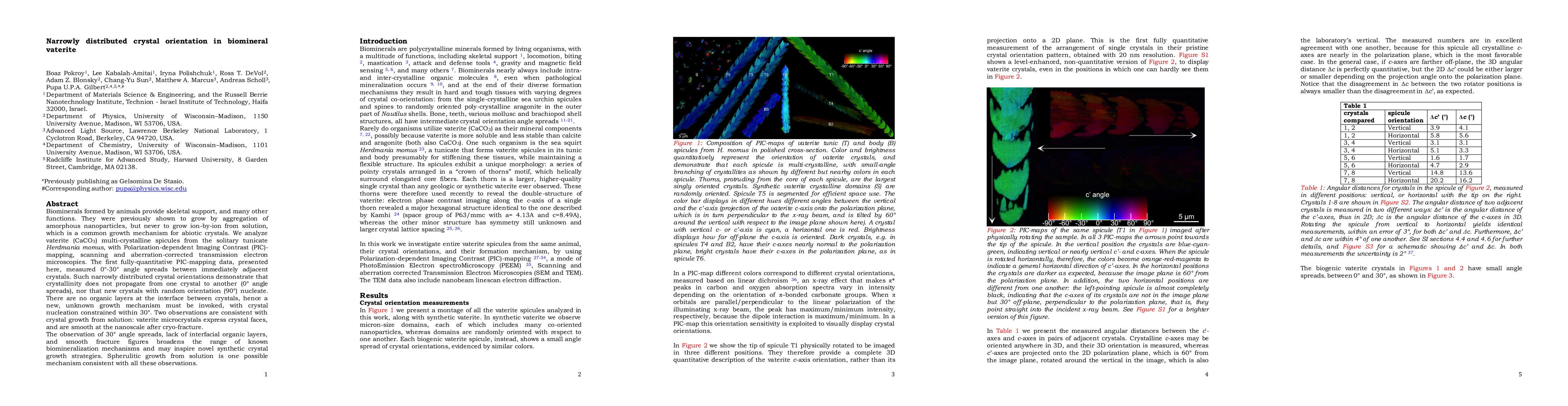 Vaterite crystals in biominerals show narrow distribution of crystal orientation, indicating a new growth mechanism that constrains nucleation within 30 degrees angle spreads.