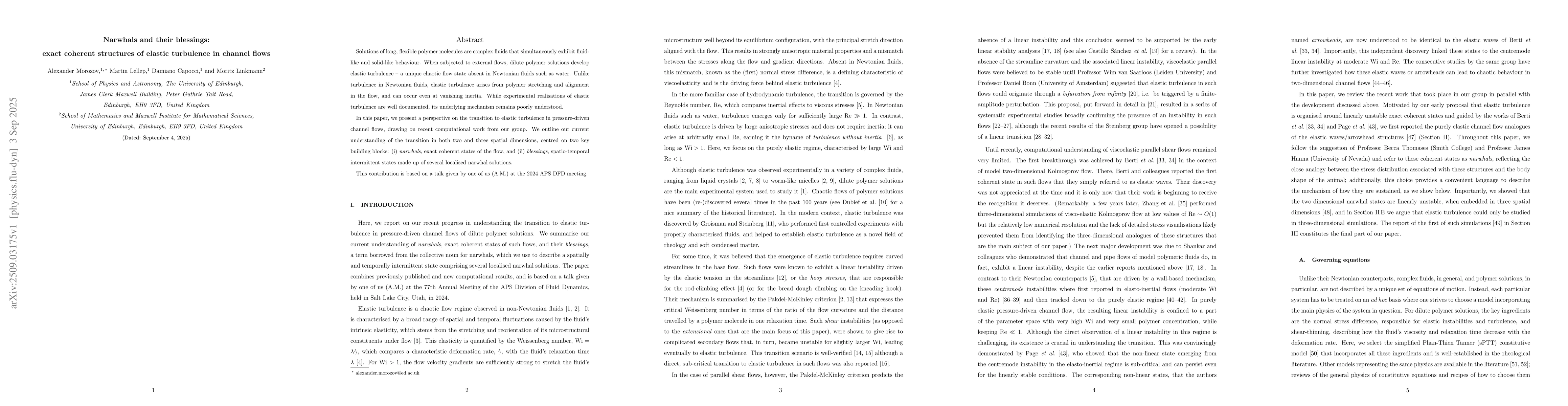Solutions of long, flexible polymer molecules are complex fluids that simultaneously exhibit fluid-like and solid-like behaviour. When subjected to external flows, dilute polymer solutions develop elastic turbulence - a unique chaotic flow state absent in Newtonian fluids such as water. Unlike turbulence in Newtonian fluids, elastic turbulence arises from polymer stretching and alignment in the flow, and can occur even at vanishing inertia. While experimental realisations of elastic turbulence are well documented, its underlying mechanism remains poorly understood. In this paper, we present a perspective on the transition to elastic turbulence in pressure-driven channel flows, drawing on recent computational work from our group. We outline our current understanding of the transition in both two and three spatial dimensions, centred on two key building blocks: (i) narwhals, exact coherent states of the flow, and (ii) blessings, spatio-temporal intermittent states made up of several localised narwhal solutions. This contribution is based on a talk given by one of us (A.M.) at the 2024 APS DFD meeting.