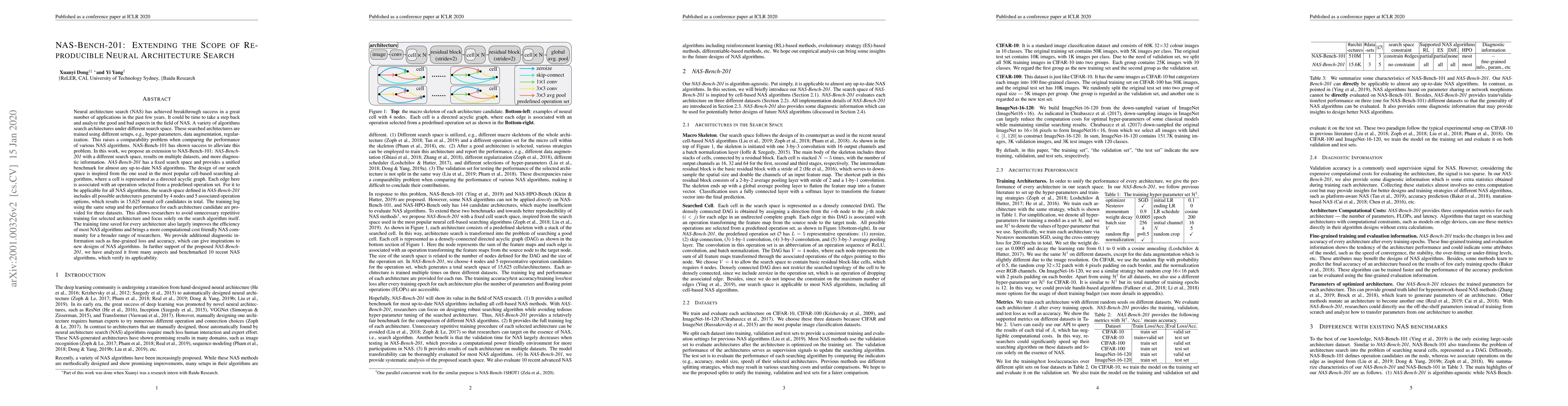 NAS-Bench-201 extends NAS-Bench-101 to provide a unified benchmark for neural architecture search algorithms, featuring a fixed search space, results on multiple datasets, and detailed diagnostic information to enhance reproducibility and efficiency. It includes 15,625 architecture candidates and supports the comparison of various NAS methods.
