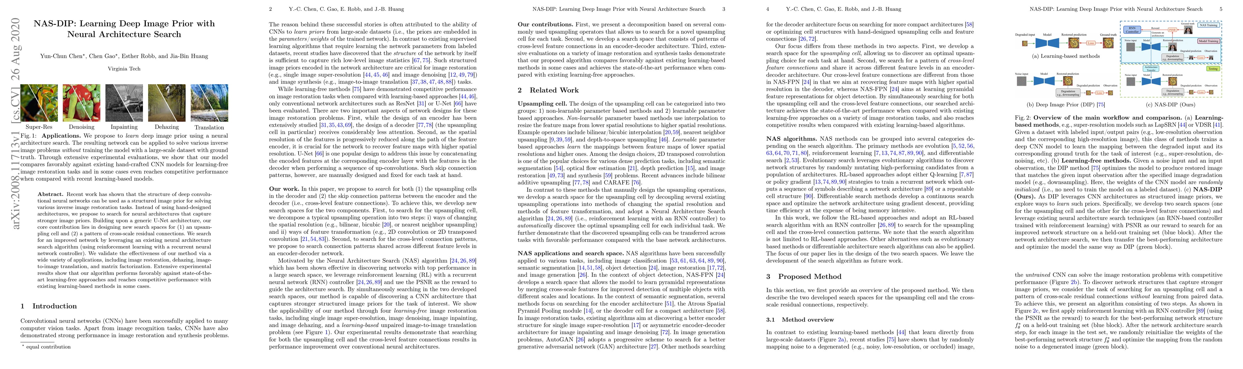 This paper proposes NAS-DIP, a method for learning deep image priors using neural architecture search to find optimal convolutional neural network architectures for image restoration tasks. The method searches for improved network structures, particularly focusing on upsampling cells and cross-scale residual connections, and demonstrates competitive performance against both learning-free and existing learning-based approaches.