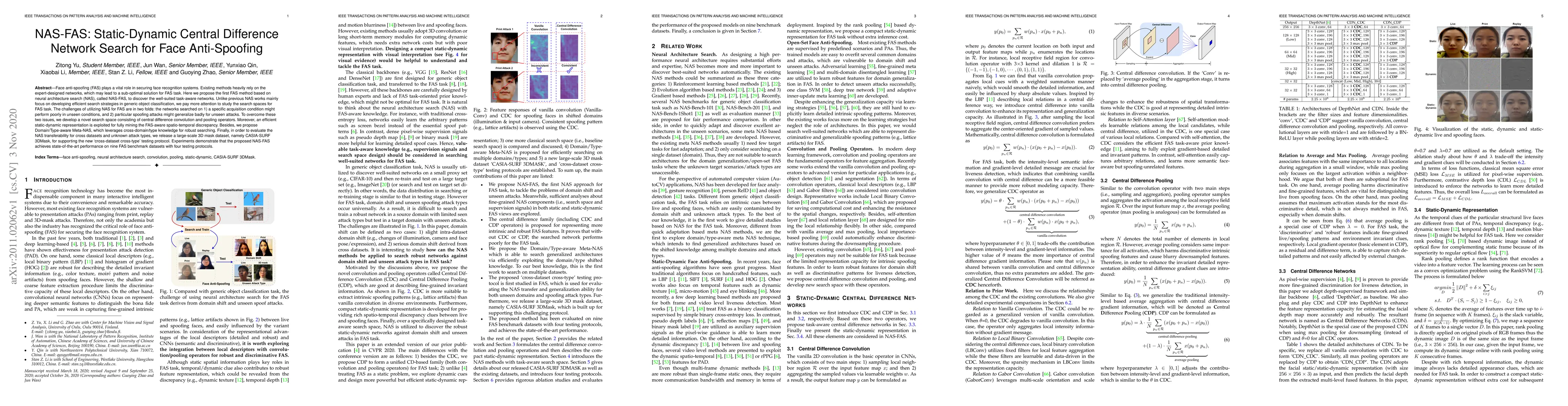 This paper proposes NAS-FAS, a neural architecture search method for face anti-spoofing, which achieves state-of-the-art performance on nine benchmark datasets with four testing protocols.