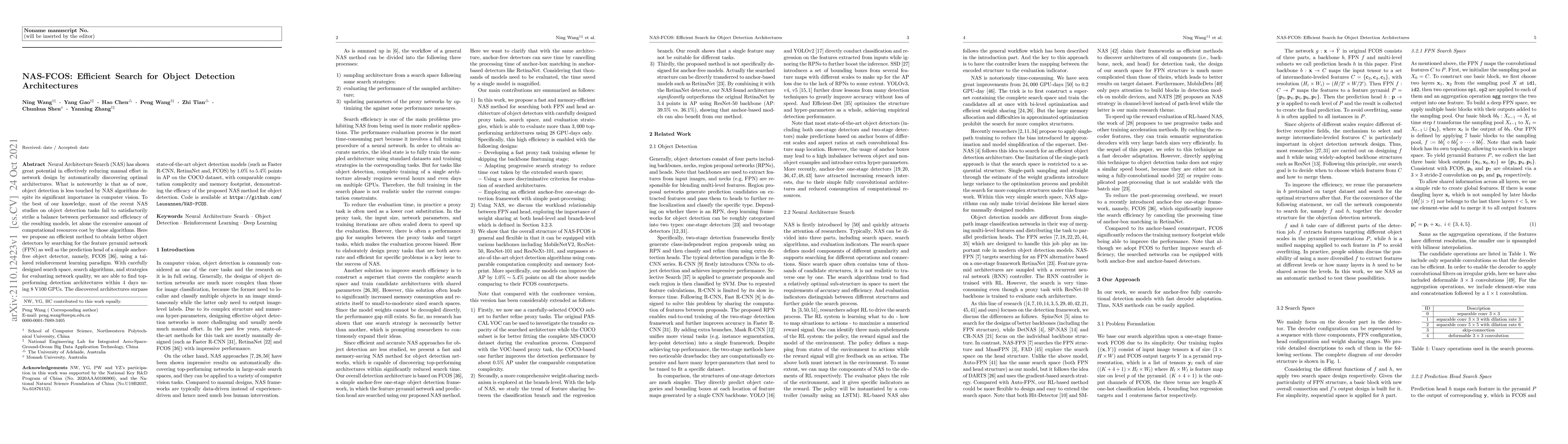 This paper proposes an efficient Neural Architecture Search (NAS) method to discover optimal feature pyramid networks and prediction heads for the FCOS anchor-free object detector, achieving better performance than state-of-the-art models on the COCO dataset with comparable computational resources. The method uses a tailored reinforcement learning paradigm and discovers top-performing architectures within 4 days using 8 V100 GPUs.