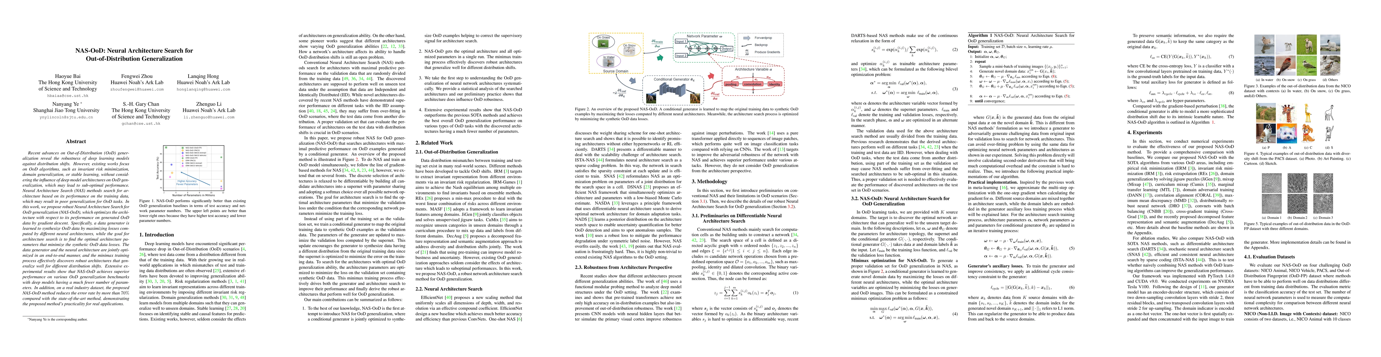 The paper proposes NAS-OoD, a novel Neural Architecture Search method that optimizes deep learning architectures specifically for Out-of-Distribution generalization by jointly training a data generator and the neural architecture to minimize losses on synthetic OoD data. This approach discovers robust architectures that significantly outperform existing methods on OoD benchmarks and reduces error rates in real-world applications.