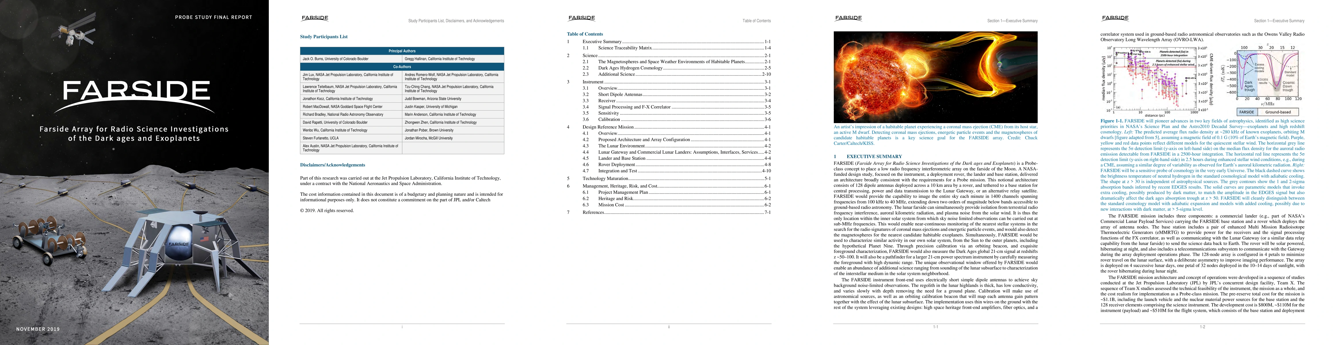 This is the final report submitted to NASA for a Probe-class concept study of the "Farside Array for Radio Science Investigations of the Dark ages and Exoplanets" (FARSIDE), a low radio frequency interferometric array on the farside of the Moon. The design study focused on the instrument, a deployment rover, the lander and base station, and delivered an architecture broadly consistent with the requirements for a Probe mission. This notional architecture consists of 128 dipole antennas deployed across a 10 km area by a rover, and tethered to a base station for central processing, power and data transmission to the Lunar Gateway, or an alternative relay satellite. FARSIDE would provide the capability to image the entire sky each minute in 1400 channels spanning frequencies from 150 kHz to 40 MHz, extending down two orders of magnitude below bands accessible to ground-based radio astronomy. The lunar farside can simultaneously provide isolation from terrestrial radio frequency interference, auroral kilometric radiation, and plasma noise from the solar wind. This would enable near-continuous monitoring of the nearest stellar systems in the search for the radio signatures of coronal mass ejections and energetic particle events, and would also detect the magnetospheres for the nearest candidate habitable exoplanets. Simultaneously, FARSIDE would be used to characterize similar activity in our own solar system, from the Sun to the outer planets. Through precision calibration via an orbiting beacon, and exquisite foreground characterization, FARSIDE would also measure the Dark Ages global 21-cm signal at redshifts from 50-100. It will also be a pathfinder for a larger 21-cm power spectrum instrument by carefully measuring the foreground with high dynamic range.