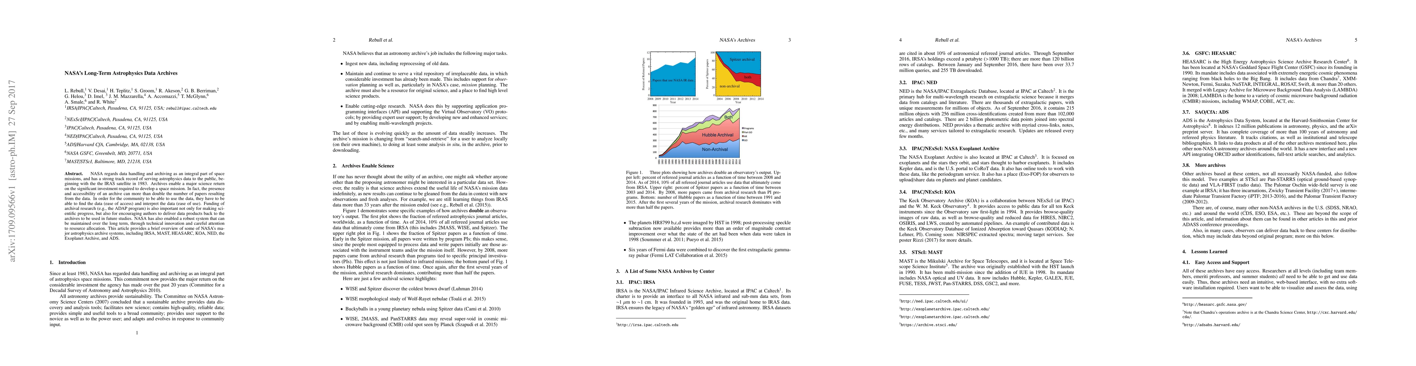 NASA's Long-Term Astrophysics Data Archives highlight the importance of data handling and archiving in space missions, emphasizing the significant scientific returns from accessible archives. The paper reviews key NASA archive systems, showcasing their role in enhancing scientific progress and long-term data usability.
