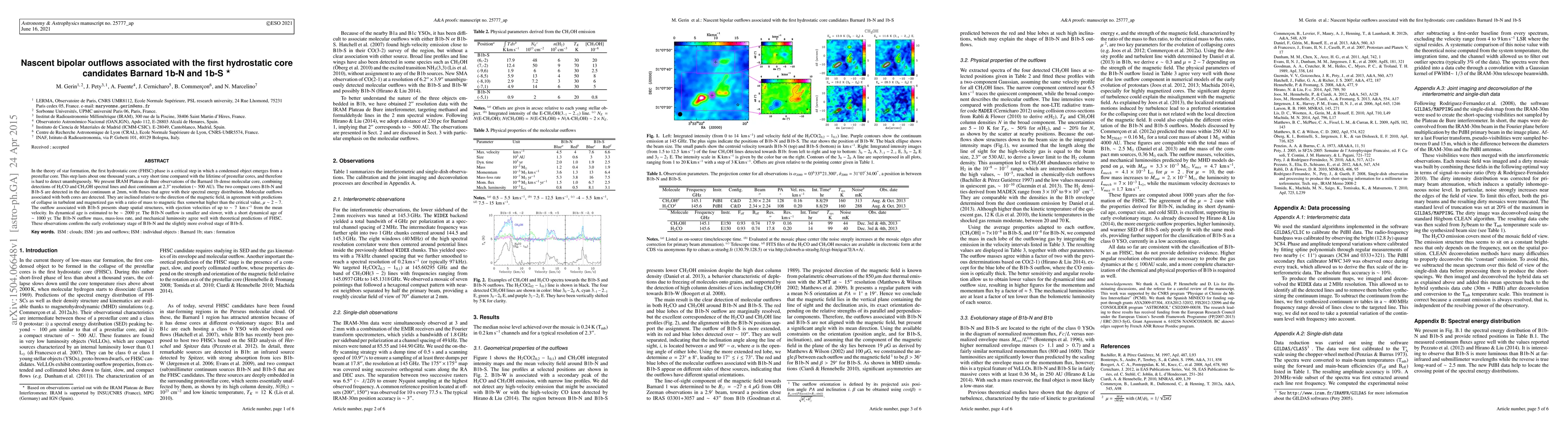 In the theory of star formation, the first hydrostatic core (FHSC) phase is a critical step in which a condensed object emerges from a prestellar core. This step lasts about one thousand years, a very short time compared with the lifetime of prestellar cores, and therefore is hard to detect unambiguously. We present IRAM Plateau de Bure observations of the Barnard 1b dense molecular core, combining detections of H2CO and CH3OH spectral lines and dust continuum at 2.3" resolution (~ 500 AU). The two compact cores B1b-N and B1b-S are detected in the dust continuum at 2mm, with fluxes that agree with their spectral energy distribution. Molecular outflows associated with both cores are detected. They are inclined relative to the direction of the magnetic field, in agreement with predictions of collapse in turbulent and magnetized gas with a ratio of mass to magnetic flux somewhat higher than the critical value, \mu ~ 2 - 7. The outflow associated with B1b-S presents sharp spatial structures, with ejection velocities of up to ~ 7 kms from the mean velocity. Its dynamical age is estimated to be ~2000 yrs. The B1b-N outflow is smaller and slower, with a short dynamical age of ~1000 yrs. The B1b-N outflow mass, mass-loss rate, and mechanical luminosity agree well with theoretical predictions of FHSC. These observations confirm the early evolutionary stage of B1b-N and the slightly more evolved stage of B1b-S.