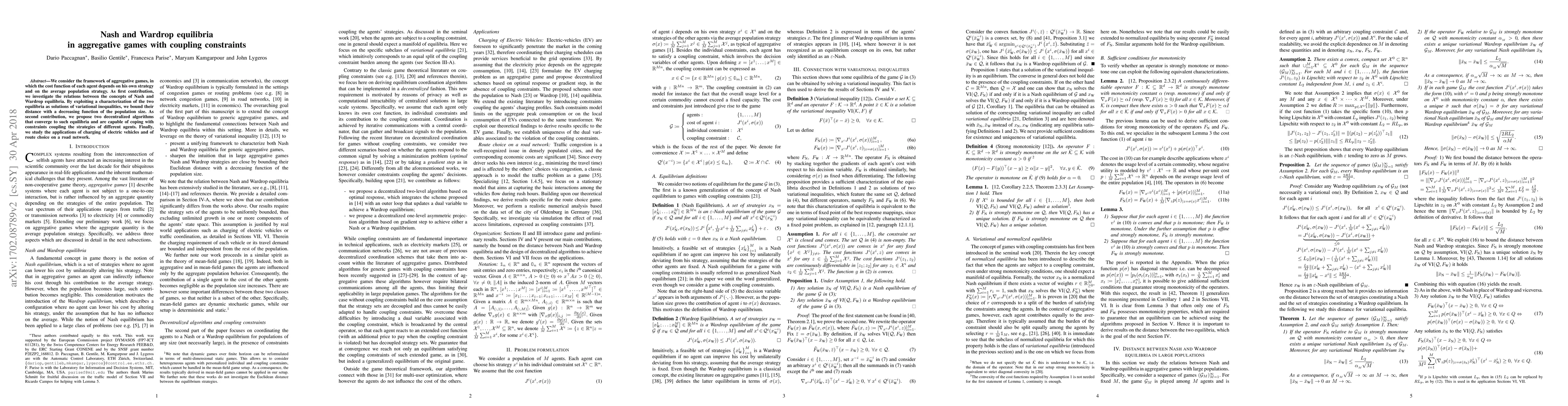 This paper explores aggregative games with coupling constraints, comparing Nash and Wardrop equilibria through variational inequalities and proposing decentralized algorithms for convergence. It also applies these concepts to electric vehicle charging and route choice on road networks.