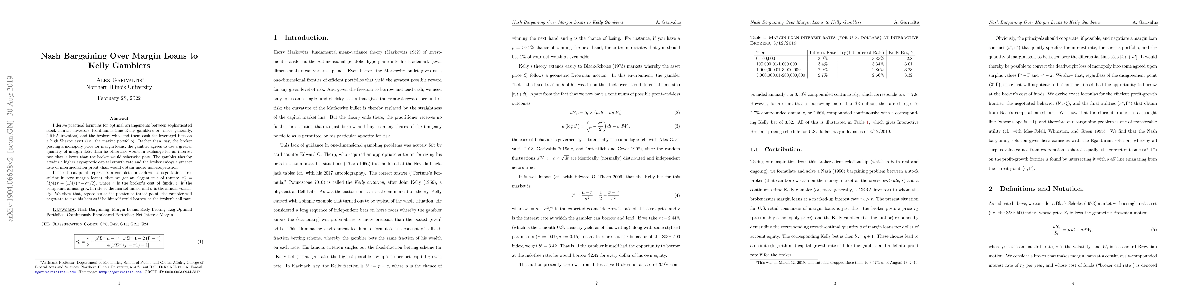 I derive practical formulas for optimal arrangements between sophisticated stock market investors (namely, continuous-time Kelly gamblers or, more generally, CRRA investors) and the brokers who lend them cash for leveraged bets on a high Sharpe asset (i.e. the market portfolio). Rather than, say, the broker posting a monopoly price for margin loans, the gambler agrees to use a greater quantity of margin debt than he otherwise would in exchange for an interest rate that is lower than the broker would otherwise post. The gambler thereby attains a higher asymptotic capital growth rate and the broker enjoys a greater rate of intermediation profit than would obtain under non-cooperation. If the threat point represents a vicious breakdown of negotiations (resulting in zero margin loans), then we get an elegant rule of thumb: $r_L^*=(3/4)r+(1/4)(\nu-\sigma^2/2)$, where $r$ is the broker's cost of funds, $\nu$ is the compound-annual growth rate of the market index, and $\sigma$ is the annual volatility. We show that, regardless of the particular threat point, the gambler will negotiate to size his bets as if he himself could borrow at the broker's call rate.