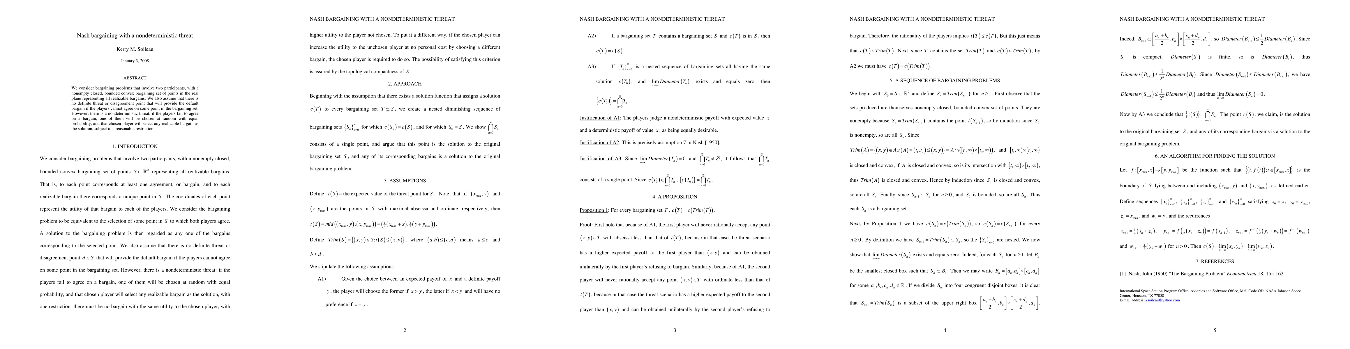 We consider bargaining problems which involve two participants, with a nonempty closed, bounded convex bargaining set of points in the real plane representing all realizable bargains. We also assume that there is no definite threat or disagreement point which will provide the default bargain if the players cannot agree on some point in the bargaining set. However, there is a nondeterministic threat: if the players fail to agree on a bargain, one of them will be chosen at random with equal probability, and that chosen player will select any realizable bargain as the solution, subject to a reasonable restriction.