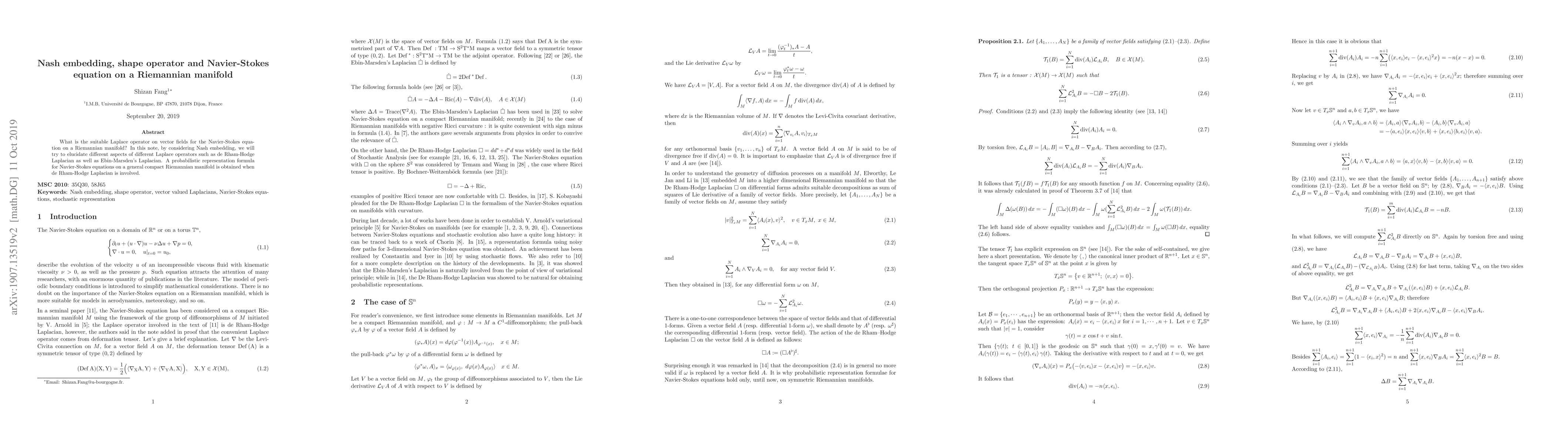 What is the suitable Laplace operator on vector fields for the Navier-Stokes equation on a Riemannian manifold? In this note, by considering Nash embedding, we will try to elucidate different aspects of different Laplace operators such as de Rham-Hodge Laplacian as well as Ebin-Marsden's Laplacian. A probabilistic representation formula for Navier-Stokes equations on a general compact Riemannian manifold is obtained when de Rham-Hodge Laplacian is involved. MSC 2010: 35Q30, 58J65