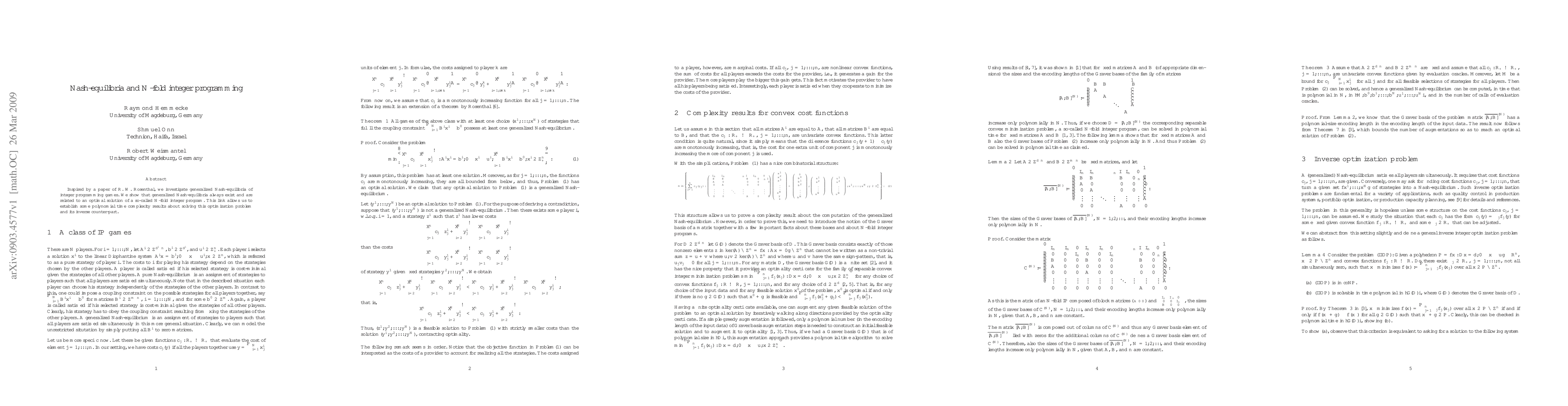 This paper demonstrates the existence of generalized Nash-equilibria in integer programming games and links them to optimal solutions of N-fold integer programs, providing polynomial time complexity results for solving both the optimization and its inverse problem.