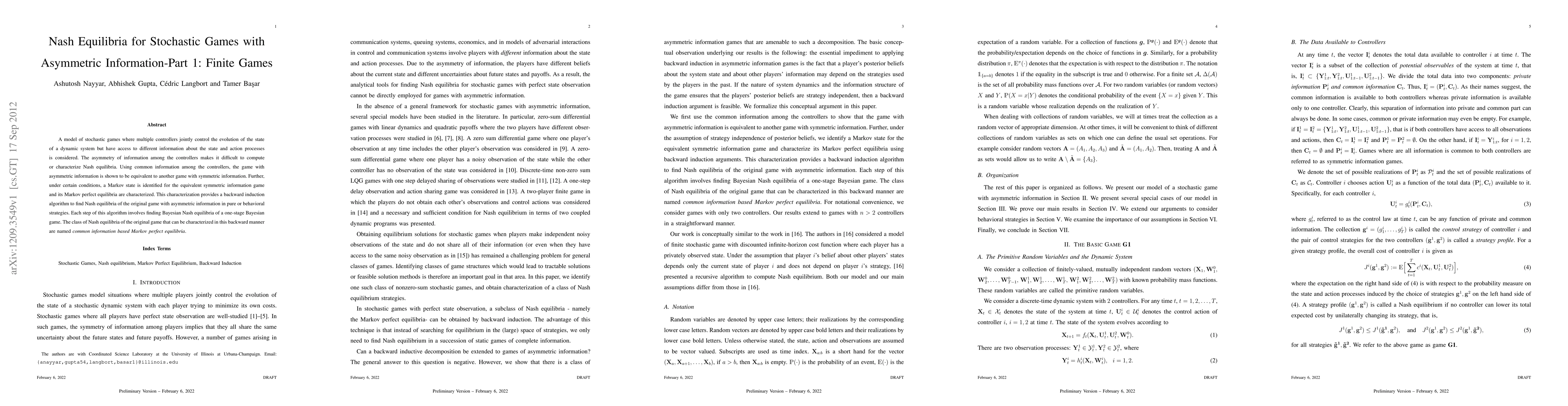 This paper explores Nash equilibria in stochastic games with asymmetric information, showing that such games can be transformed into equivalent symmetric information games using common information. It characterizes Markov perfect equilibria of the equivalent game and provides a backward induction algorithm for finding Nash equilibria in the original game.