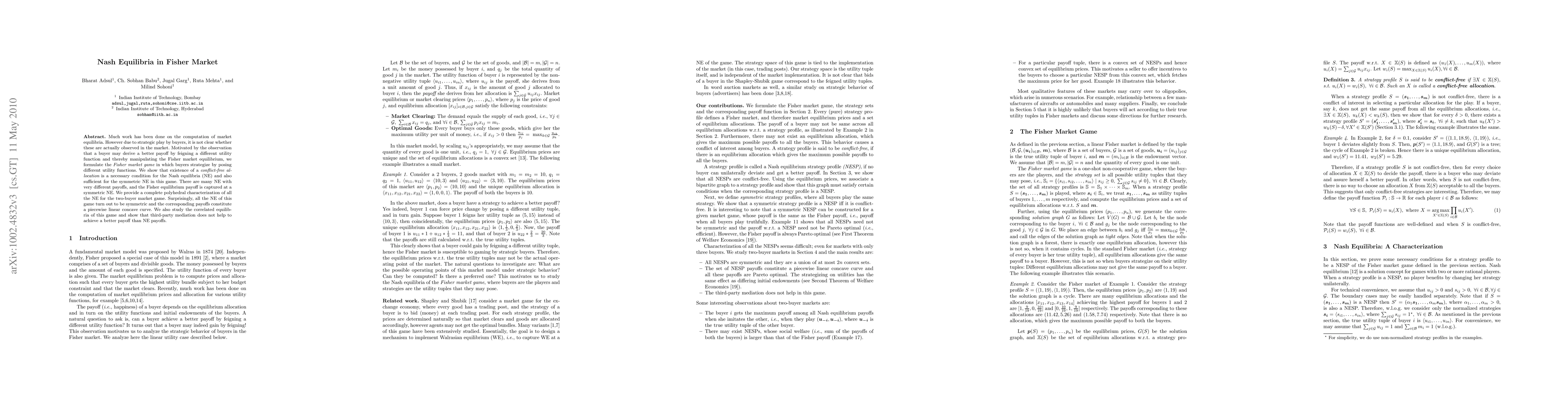 Much work has been done on the computation of market equilibria. However due to strategic play by buyers, it is not clear whether these are actually observed in the market. Motivated by the observation that a buyer may derive a better payoff by feigning a different utility function and thereby manipulating the Fisher market equilibrium, we formulate the {\em Fisher market game} in which buyers strategize by posing different utility functions. We show that existence of a {\em conflict-free allocation} is a necessary condition for the Nash equilibria (NE) and also sufficient for the symmetric NE in this game. There are many NE with very different payoffs, and the Fisher equilibrium payoff is captured at a symmetric NE. We provide a complete polyhedral characterization of all the NE for the two-buyer market game. Surprisingly, all the NE of this game turn out to be symmetric and the corresponding payoffs constitute a piecewise linear concave curve. We also study the correlated equilibria of this game and show that third-party mediation does not help to achieve a better payoff than NE payoffs.