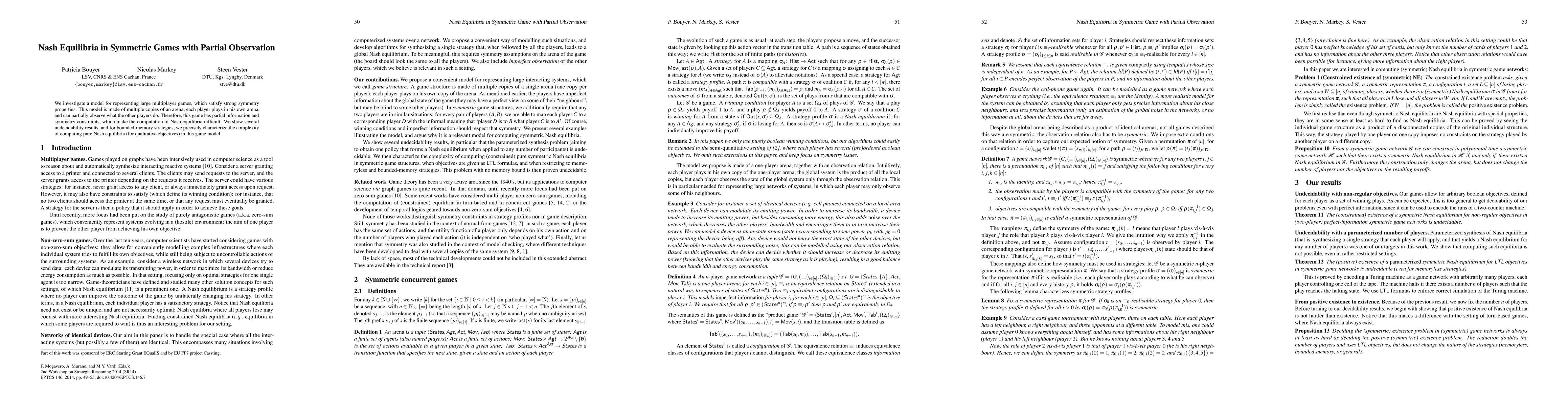 This paper explores a symmetric multiplayer game model with partial observation, showing undecidability in computing Nash equilibria and characterizing the complexity for games with bounded-memory strategies. The model's inherent symmetry and partial information present significant computational challenges.