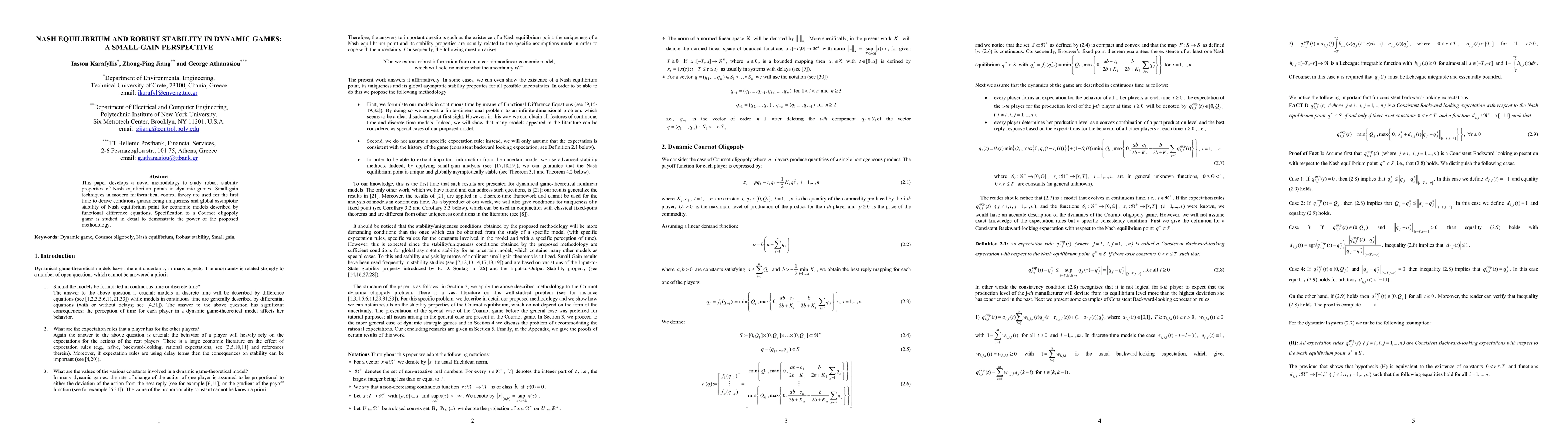 This paper uses small-gain techniques to study the stability of Nash equilibrium points in dynamic games, providing conditions for uniqueness and global asymptotic stability in economic models. The methodology is demonstrated through a Cournot oligopoly game, showing its power in analyzing robust stability properties.