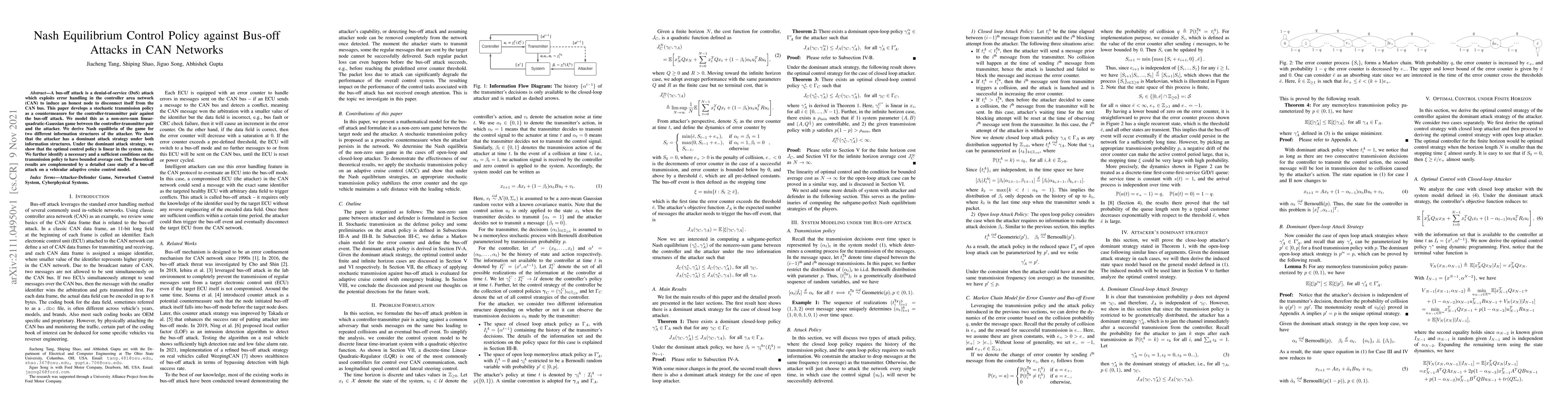 A paper proposes a Nash Equilibrium Control Policy to counter bus-off attacks in CAN networks, showing that an optimal policy can be linear in the system state and identify necessary conditions for bounded average cost.