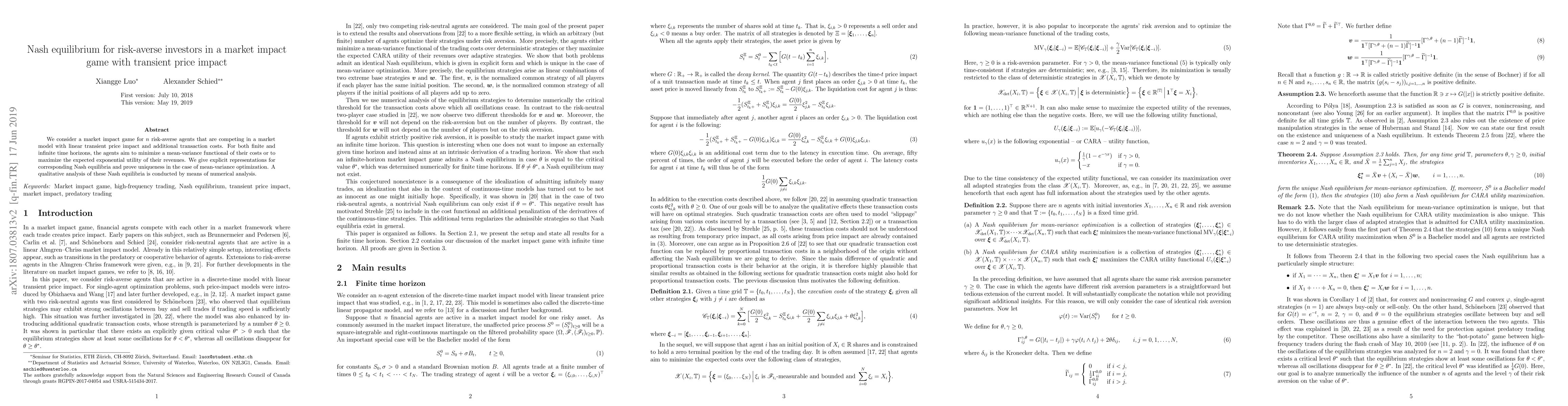 We consider a market impact game for $n$ risk-averse agents that are competing in a market model with linear transient price impact and additional transaction costs. For both finite and infinite time horizons, the agents aim to minimize a mean-variance functional of their costs or to maximize the expected exponential utility of their revenues. We give explicit representations for corresponding Nash equilibria and prove uniqueness in the case of mean-variance optimization. A qualitative analysis of these Nash equilibria is conducted by means of numerical analysis.