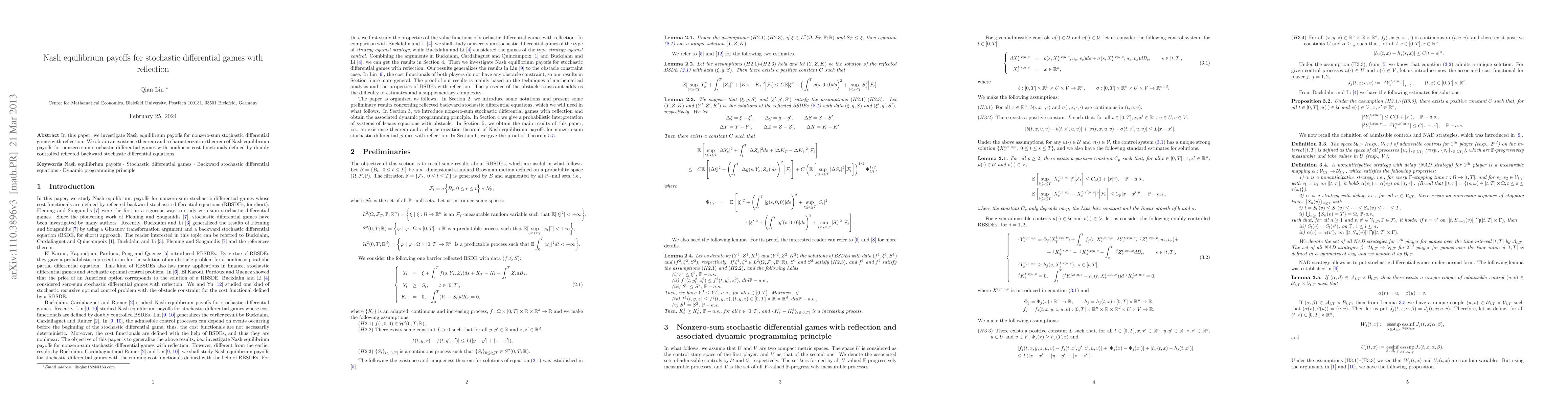 This paper investigates Nash equilibrium payoffs for nonzero-sum stochastic differential games with reflection, establishing an existence theorem and a characterization of these payoffs through nonlinear cost functionals defined by doubly controlled reflected backward stochastic differential equations.