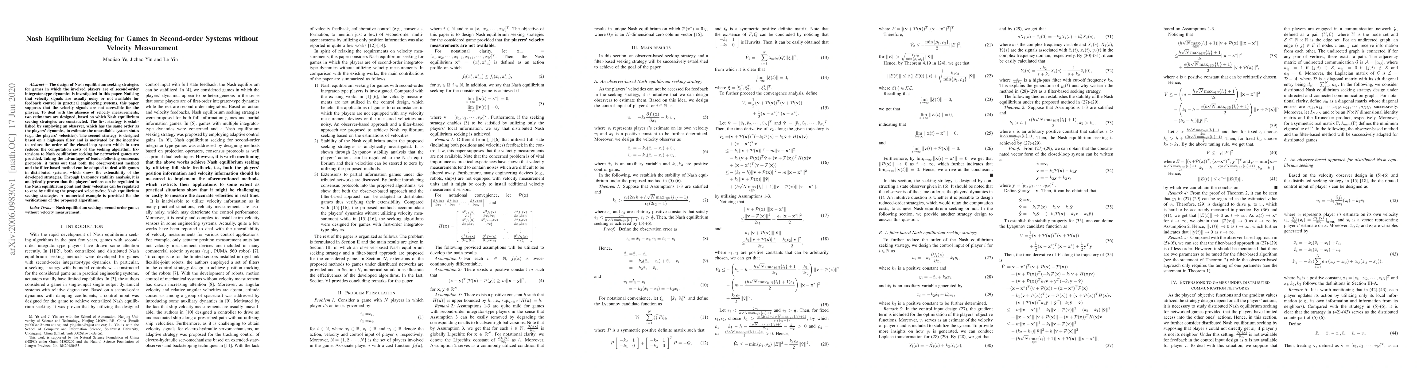 This paper investigates Nash equilibrium seeking strategies for second-order games where velocity measurements are unavailable. It proposes two velocity-free strategies: an observer-based method and a high-pass filter-based method, both of which are shown to lead players to Nash equilibrium through Lyapunov stability analysis.