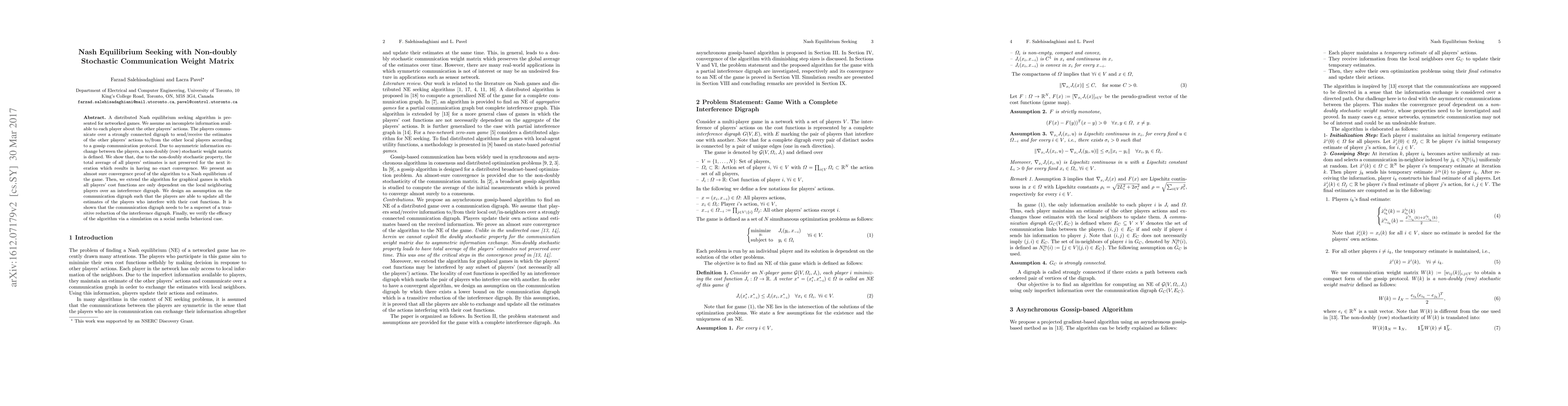 A distributed Nash equilibrium seeking algorithm is presented for networked games. We assume an incomplete information available to each player about the other players' actions. The players communicate over a strongly connected digraph to send/receive the estimates of the other players' actions to/from the other local players according to a gossip communication protocol. Due to asymmetric information exchange between the players, a non-doubly (row) stochastic weight matrix is defined. We show that, due to the non-doubly stochastic property, the total average of all players' estimates is not preserved for the next iteration which results in having no exact convergence. We present an almost sure convergence proof of the algorithm to a Nash equilibrium of the game. Then, we extend the algorithm for graphical games in which all players' cost functions are only dependent on the local neighboring players over an interference digraph. We design an assumption on the communication digraph such that the players are able to update all the estimates of the players who interfere with their cost functions. It is shown that the communication digraph needs to be a superset of a transitive reduction of the interference digraph. Finally, we verify the efficacy of the algorithm via a simulation on a social media behavioral case.