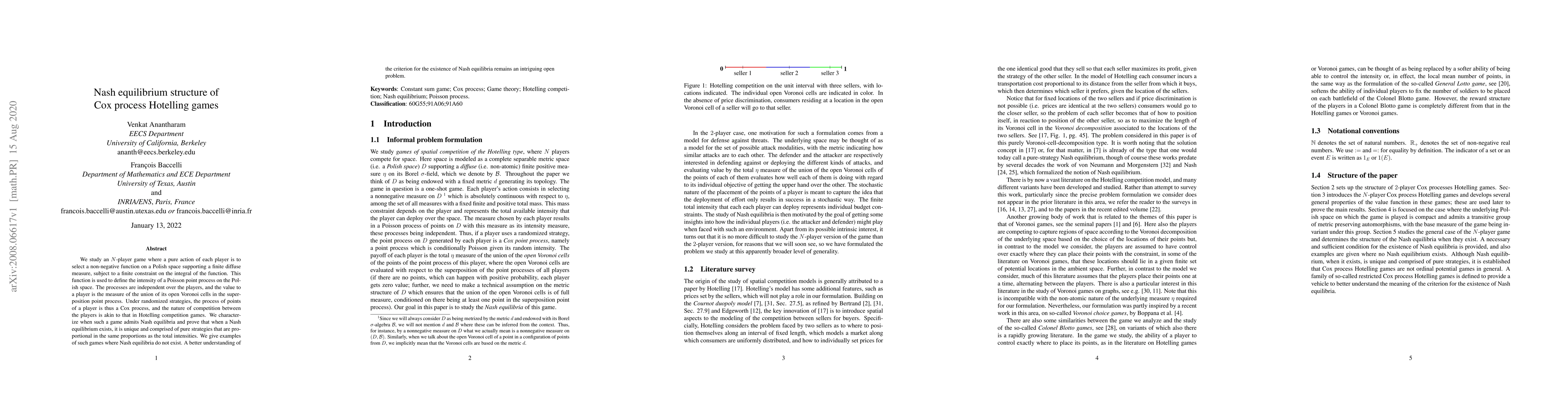 Researchers studied a game where players select non-negative functions to define intensity in Poisson point processes, finding that Nash equilibria exist when total intensities are proportional, but not always.